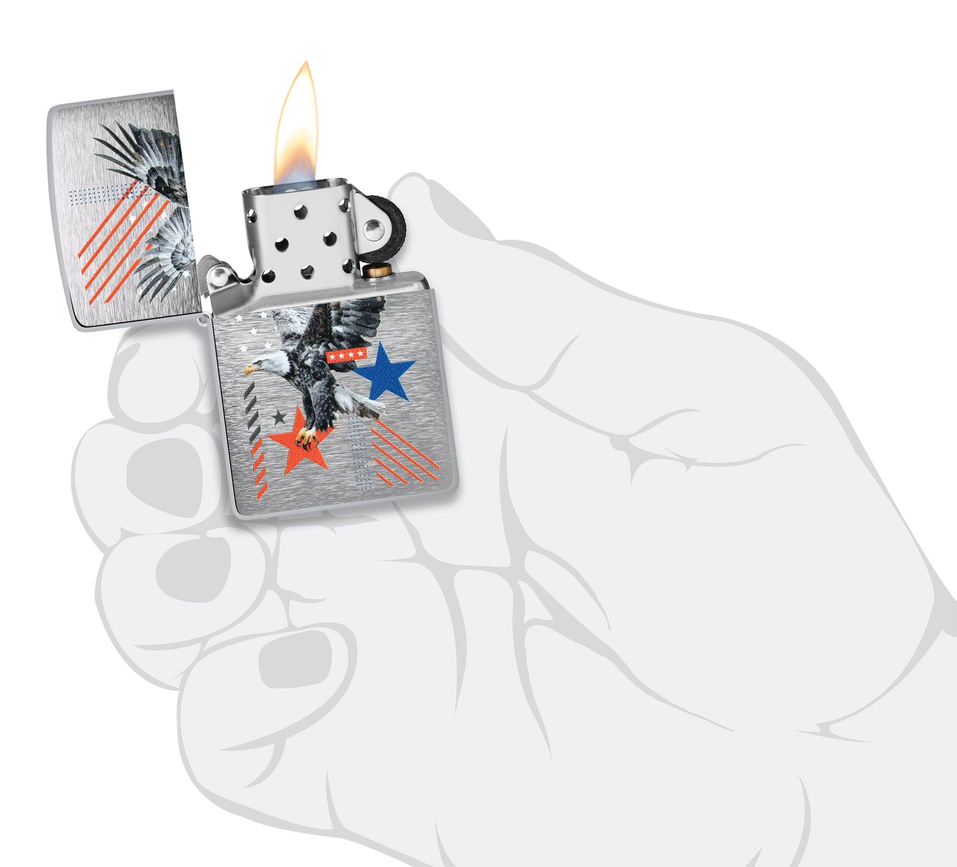 Backed by patriotic stars and stripes, a regal eagle soars across the surface of this classic Brushed Chrome lighter in a bold Color Image design.