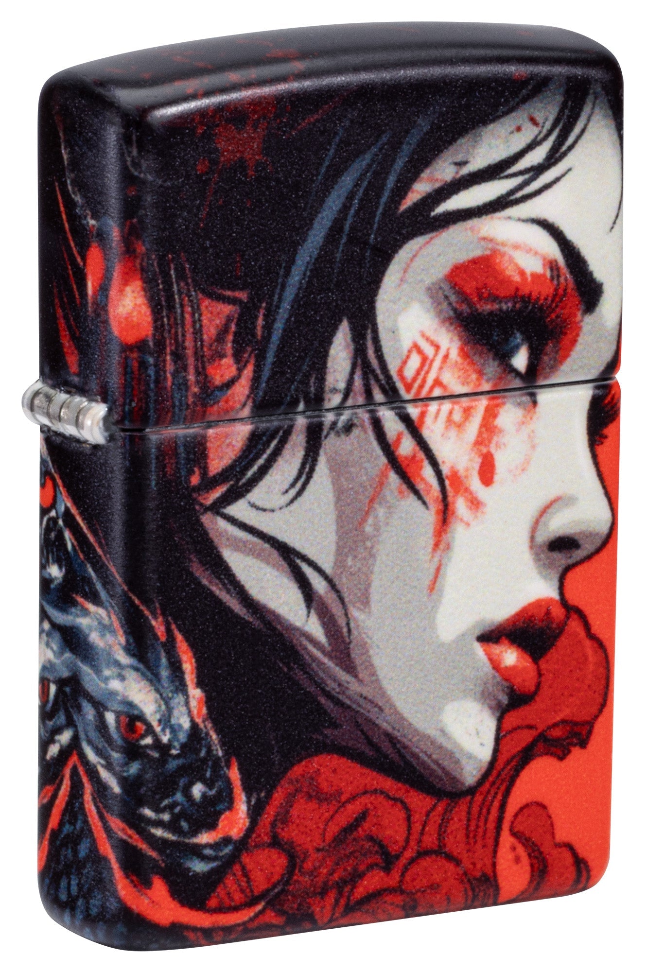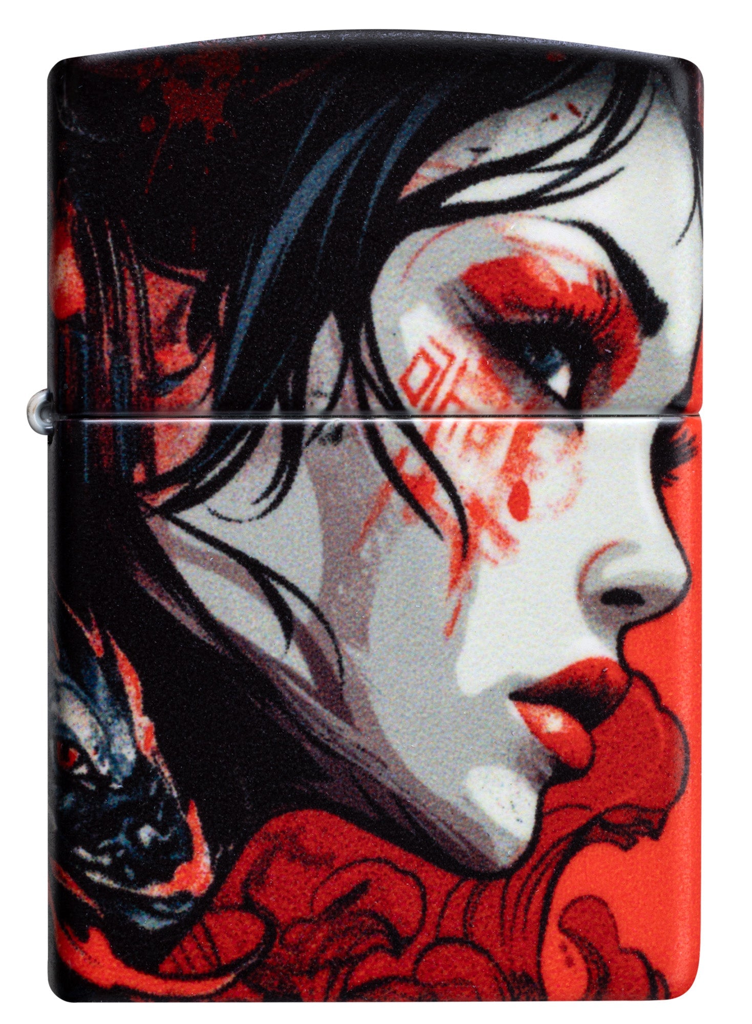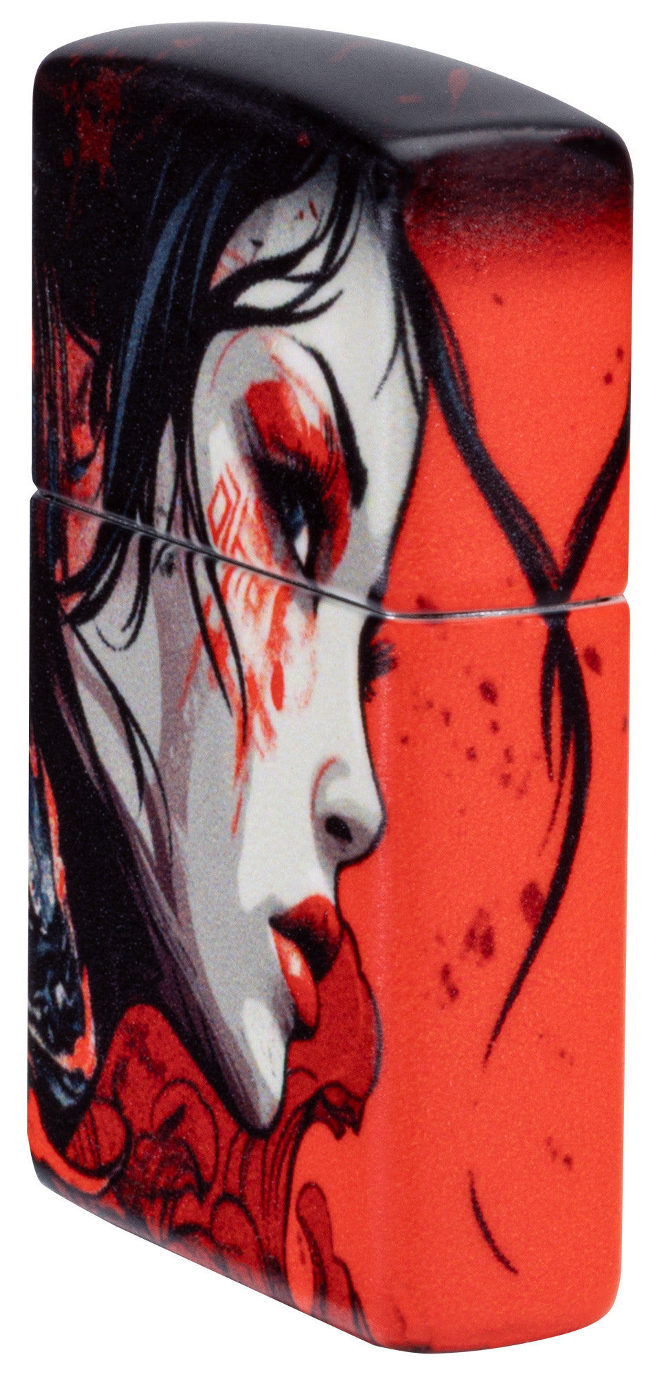 In feudal Japan, fierce female warriors trained both for battle and to defend their homes and land. This classic 540° Color lighter features a brave samurai in a vibrant, abstract design that extends around all sides of the piece.