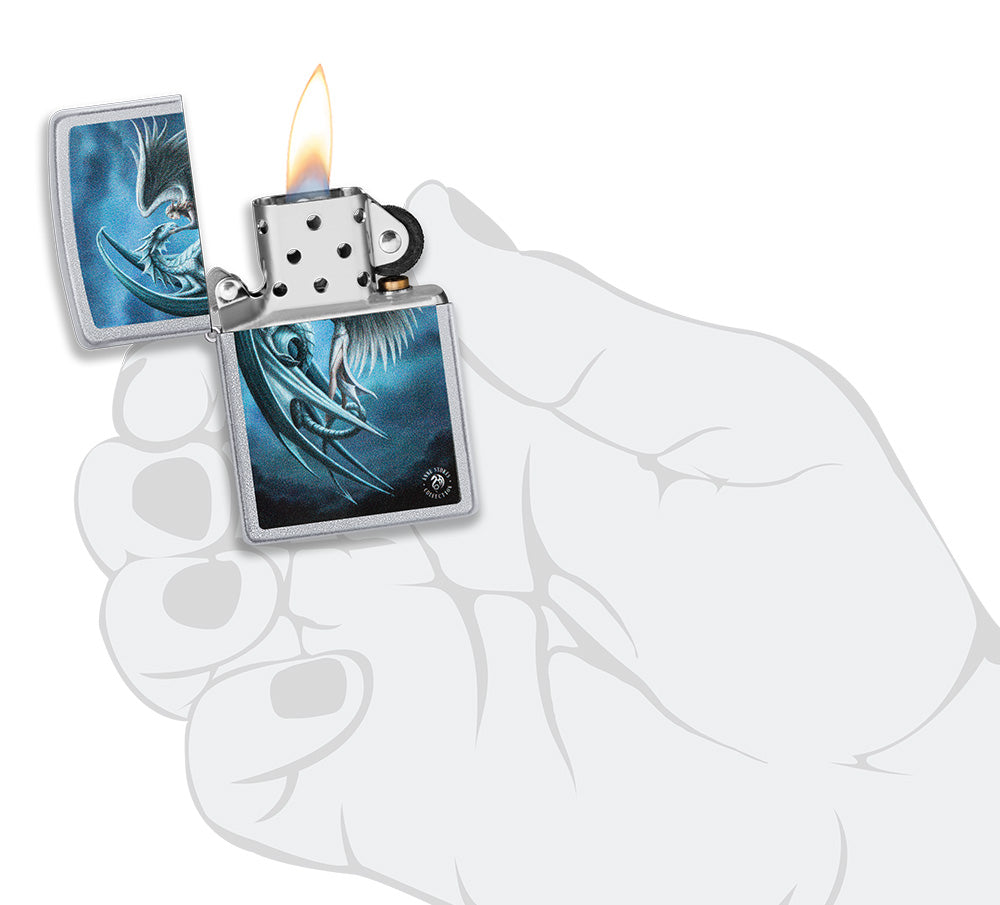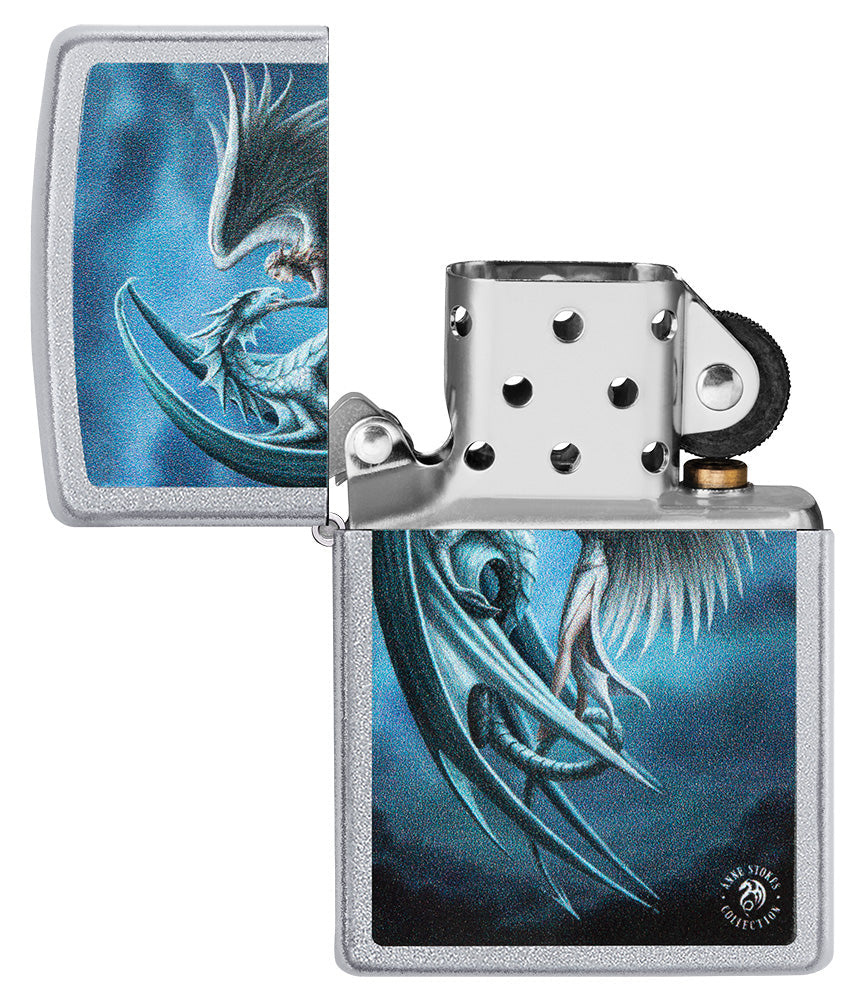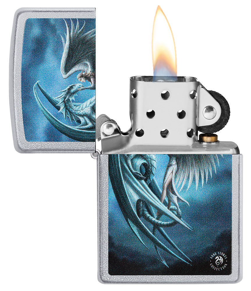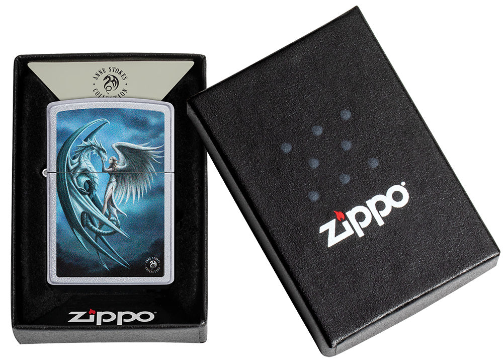The Zippo lighter with satin chrome finish presents a fascinating design featuring a majestic dragon and a woman with angel wings. The colorful image shows the woman tenderly caressing the dragon's face as they gaze lovingly at each other. The combination of the shiny satin chrome finish and the vibrant color image gives this lighter a unique and aesthetically pleasing look.