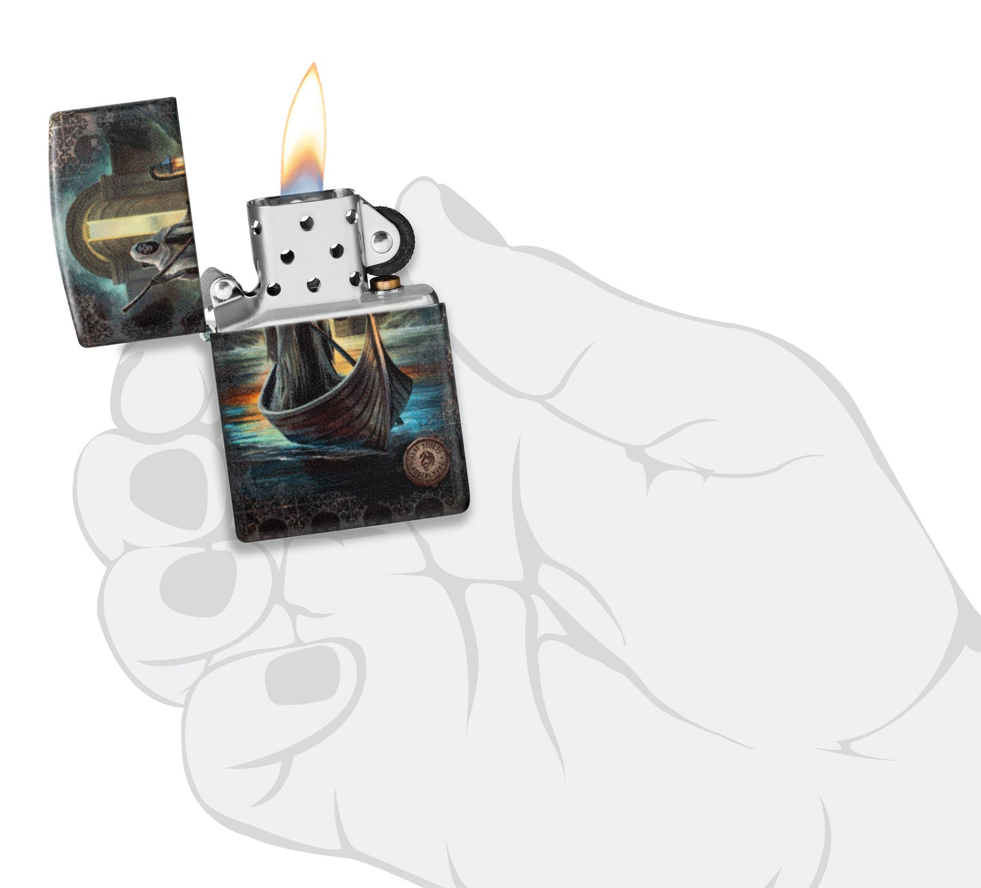 The mystical art of Anne Stokes comes to live on this classic 540 Color lighter. Inspired by Greek legends, "The Ferryman" depicts the character who transports the souls of the recently departed. The haunting image is surrounded by a suble skull motif, which centers on an hourglass on the reverse side of the piece as a mortal reminder.Â