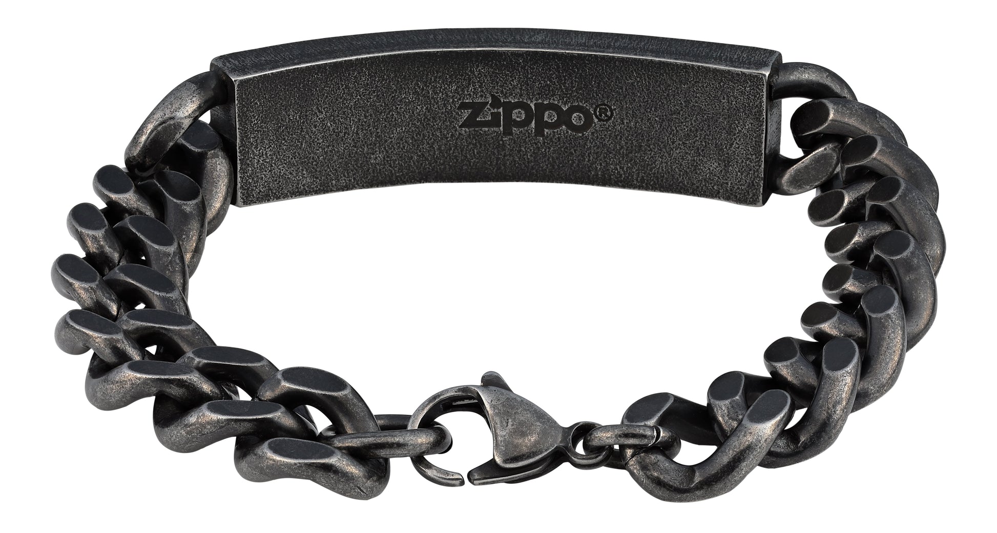 Stainless steel link bracelet featuring a black matt antique finish and clasp. The inside of the plate is decorated with the original Zippo logo with the outside featuring the Zippo flame.