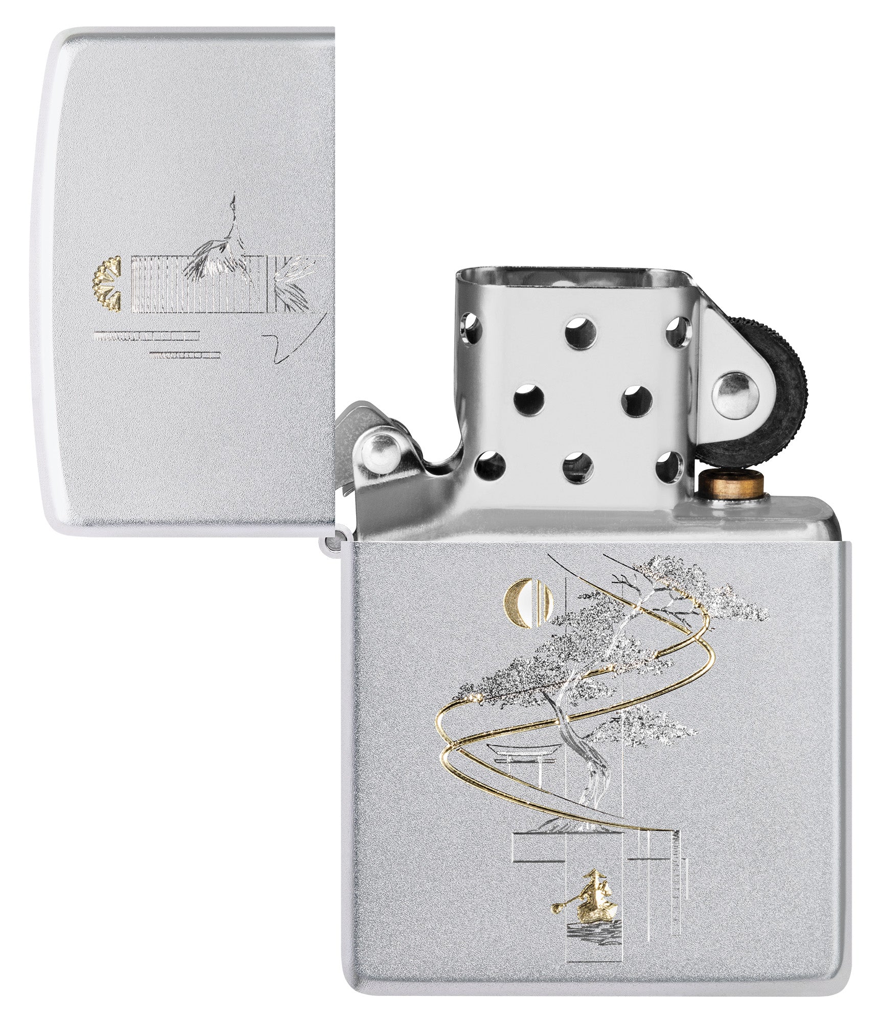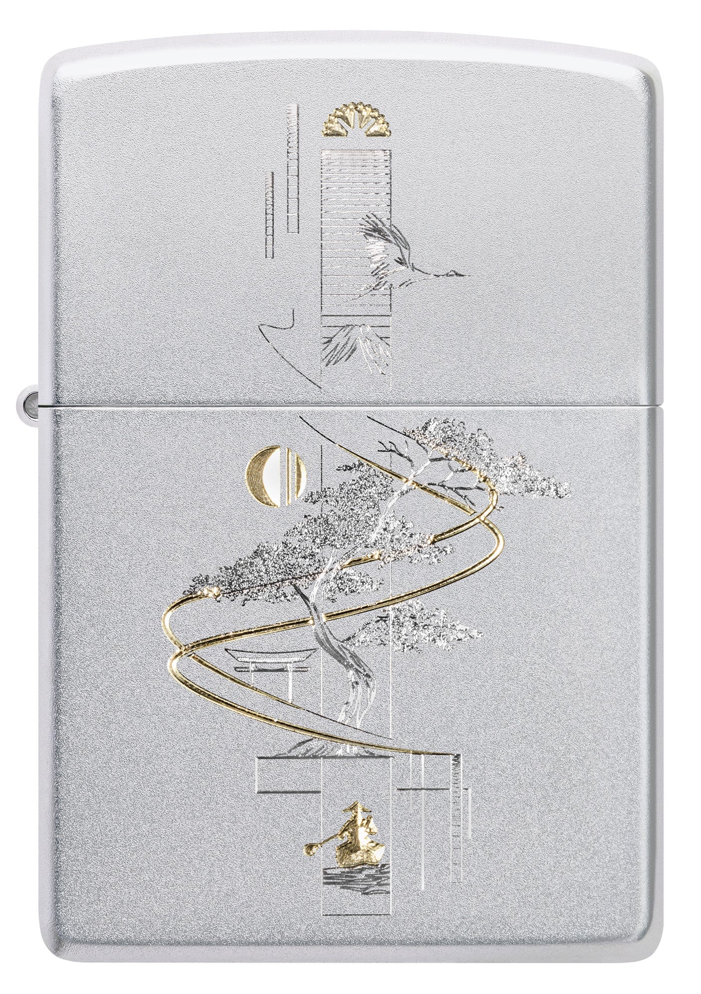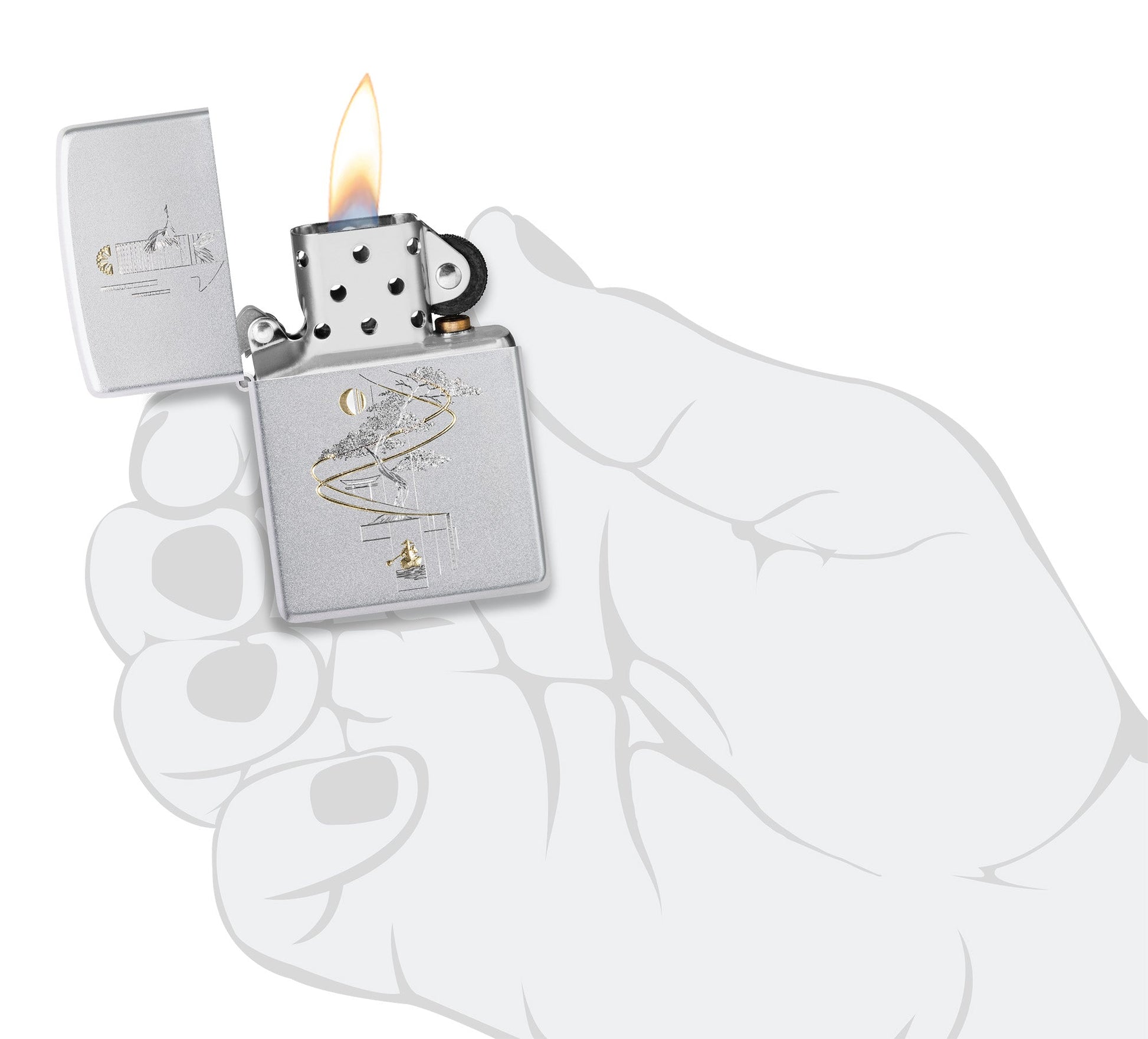Representing harmony between art and nature, a delicate bonsai tree is depicted on this classic Satin Chrome lighter in a soothing Auto.