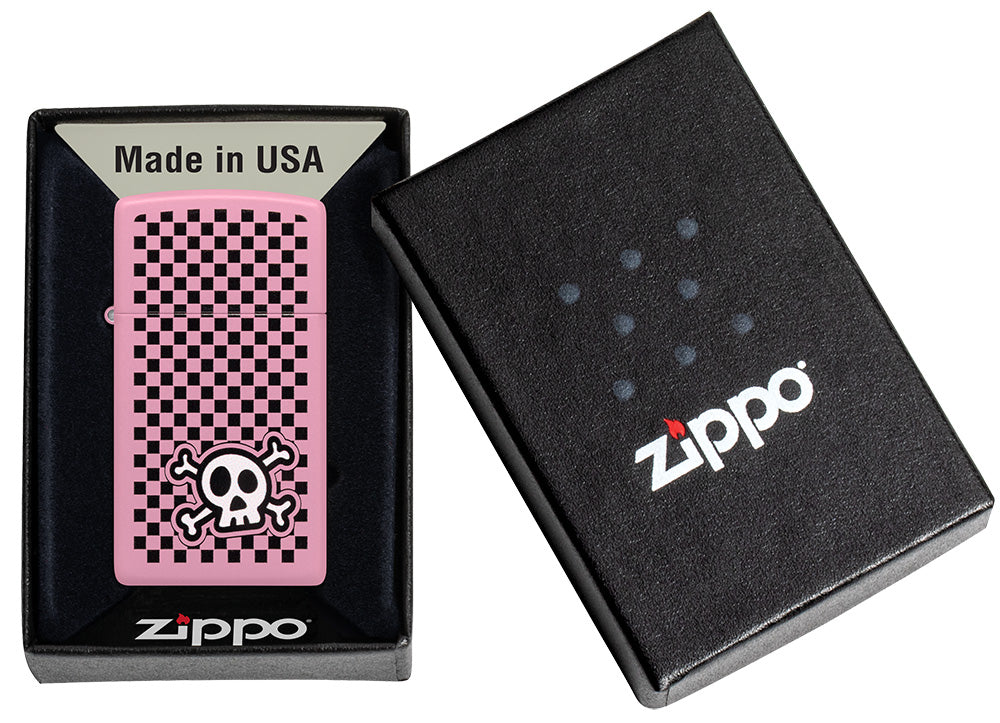 This Slim® Pink Matte lighter packs cuteness with a punch. A tattoo-inspired skull sits sweetly atop a checkerboard pattern in a fresh and playful Color Image design.