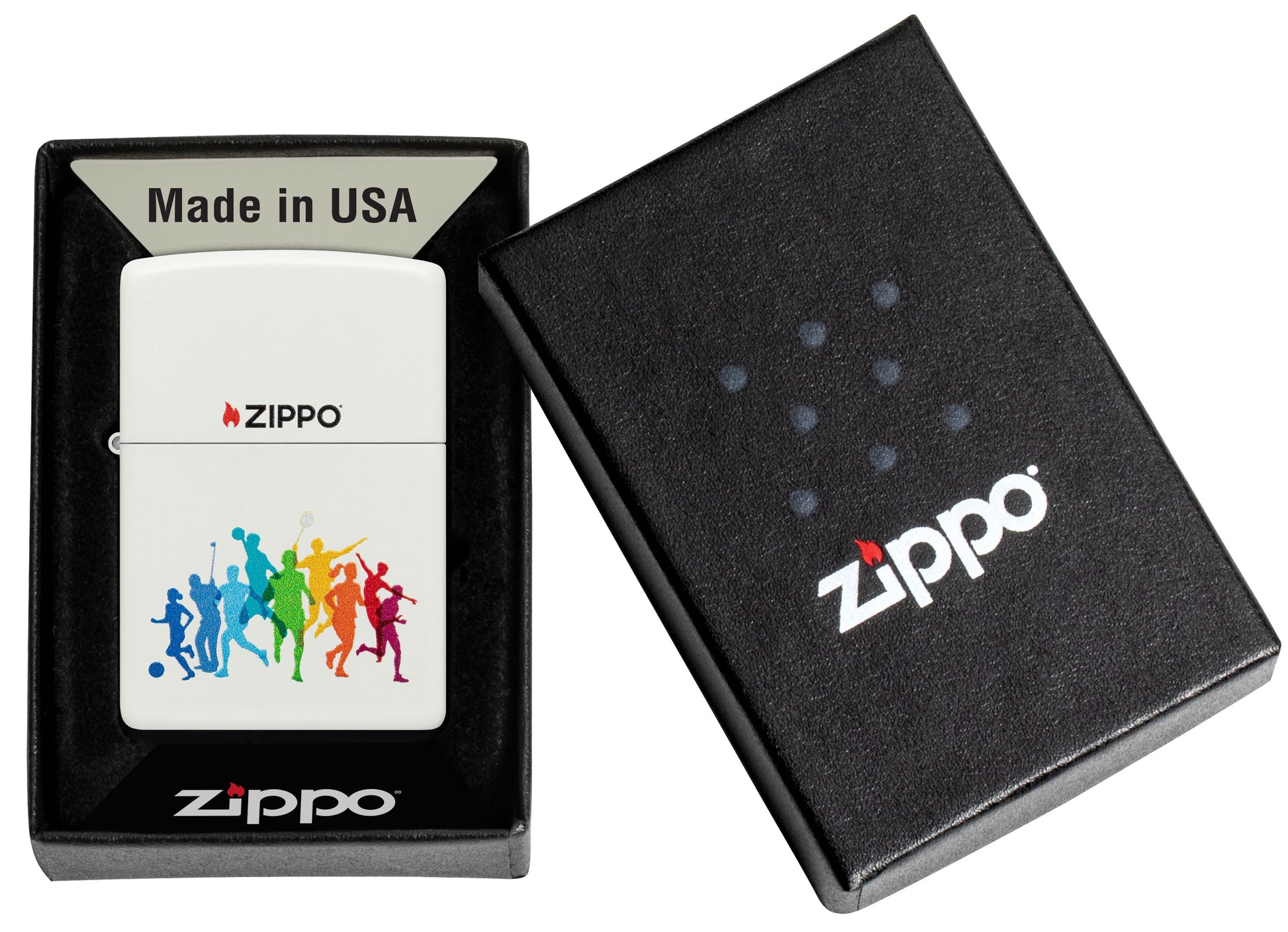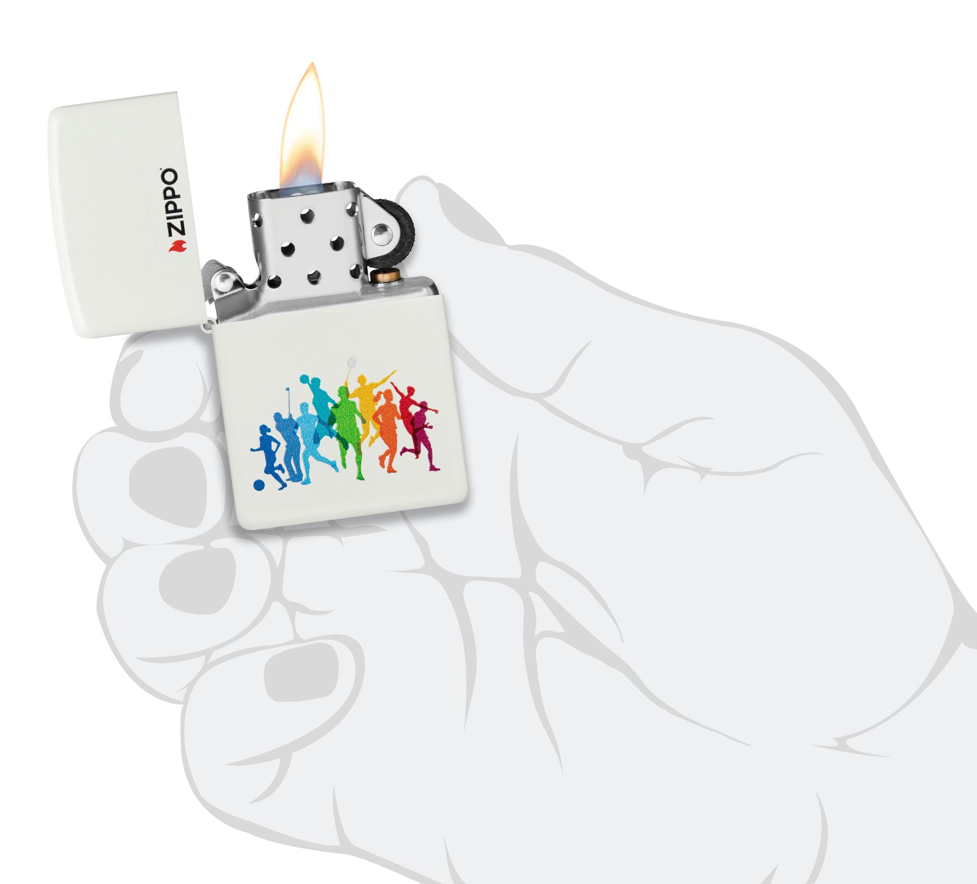 From golf to tennis to volleyball, your favourite summer games are brilliantly captured in vivid rainbow tones on this classic White Matte lighter in a bold Color Image design.