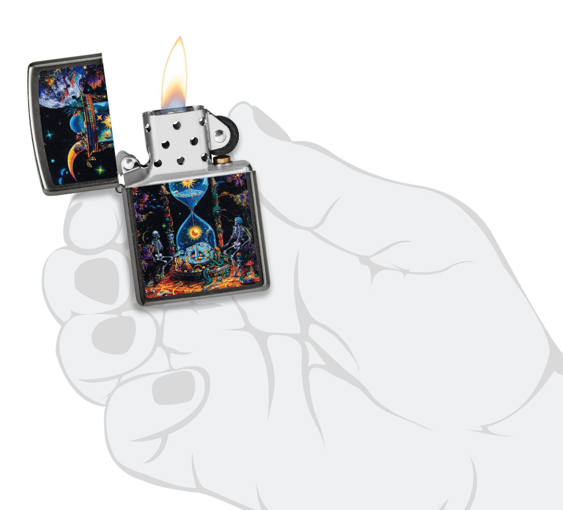 Life, death and the cosmos are pictured in perfect balance on this classic Grey lighter. Time and space form a perpetual hourglass in a mystical Color Image design.