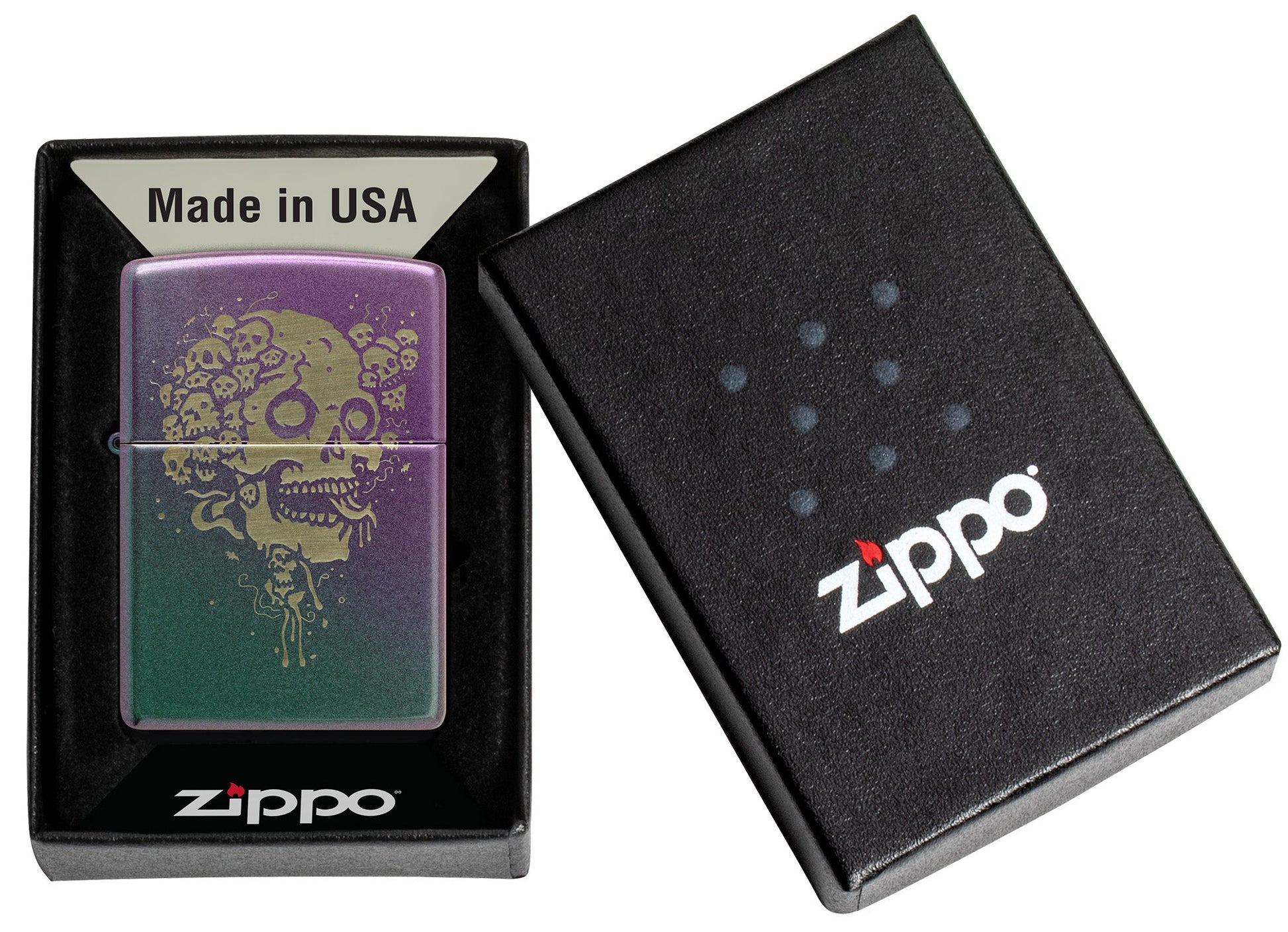 Horror fans will delight in this classic Iridescent lighter. A grinning bunch of miniature skulls surround a larger one in the menacing Laser Engrave design.