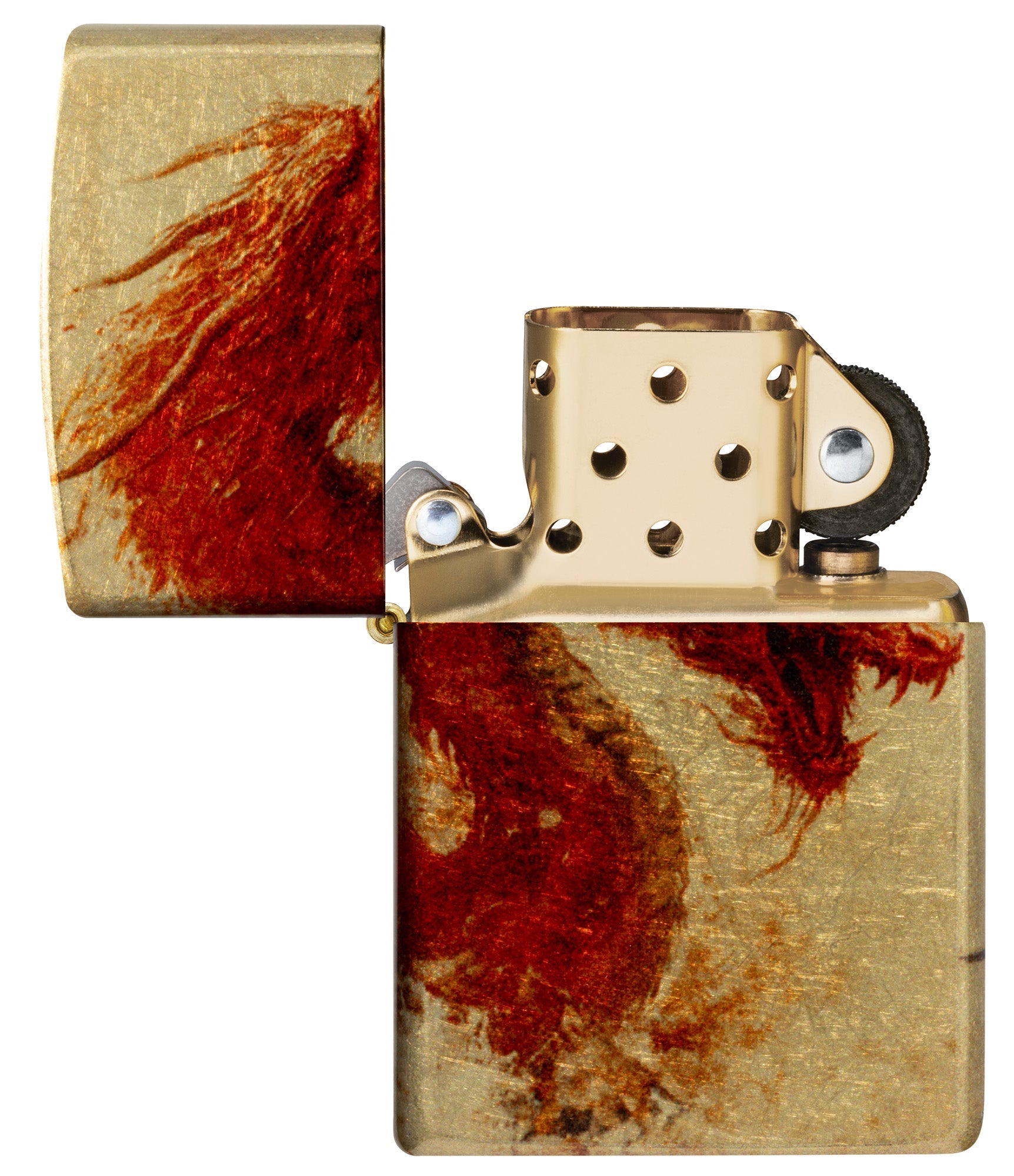 Harness the power of the mighty dragon with this classic Tumbled Brass lighter. The mesmerizing 540 Fusion design features an intricate, fiery dragon that seamlessly morphs into a brave samurai on the reverse side of the piece.
