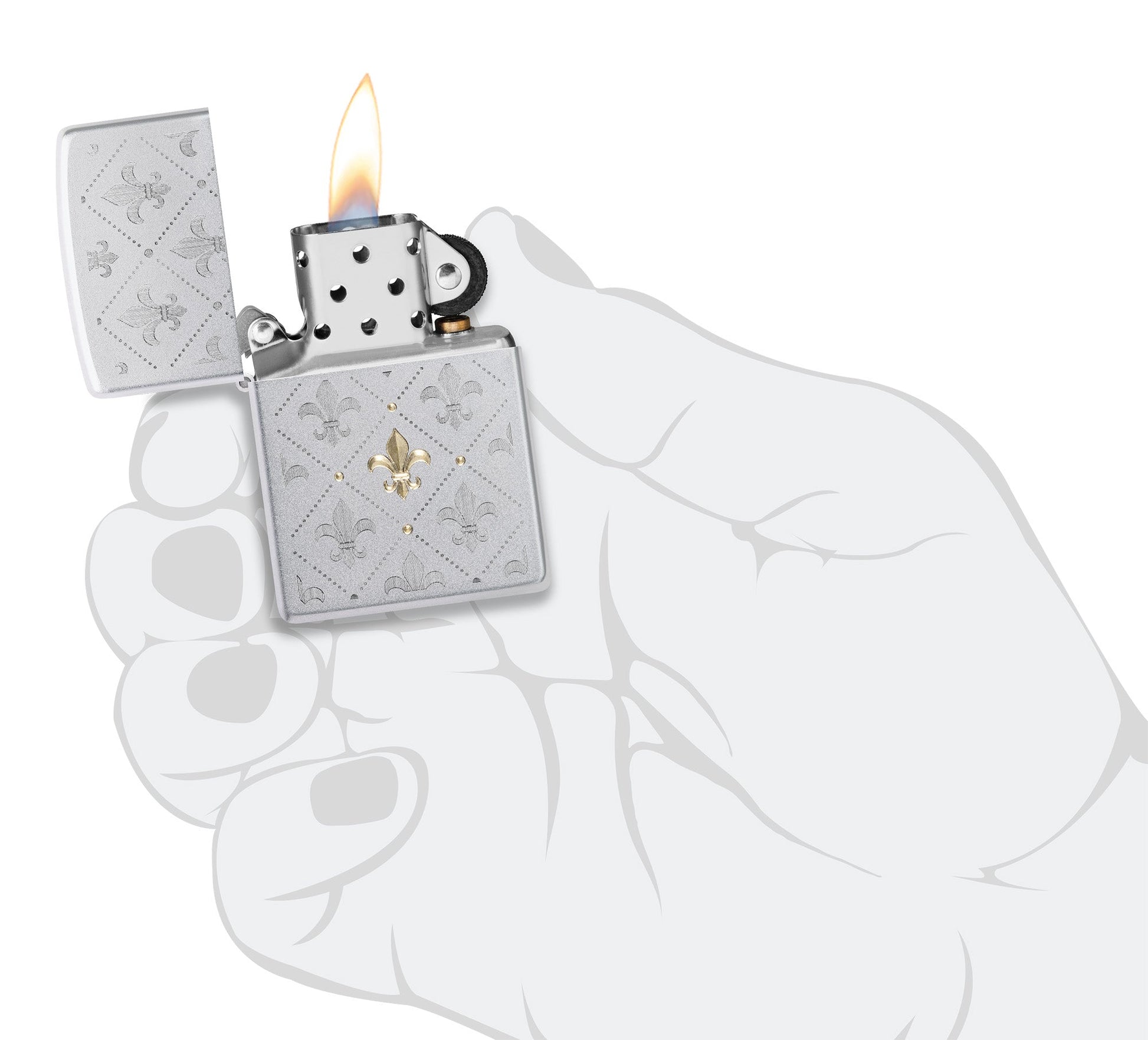 Believed to represent unity and resilience, the iconic fleur-de-lis symbol is depicted in a mesmerizing motif on this classic Satin Chrome lighter in a handsome Auto Two-Tone design, which lends luxurious contrast.