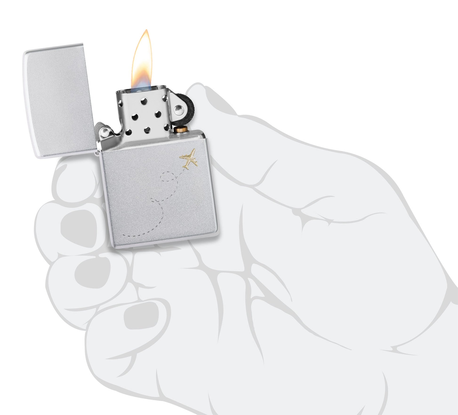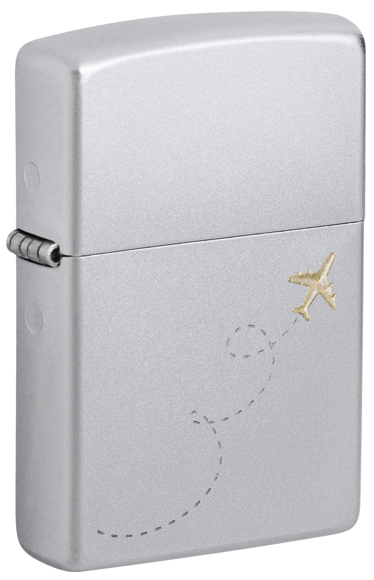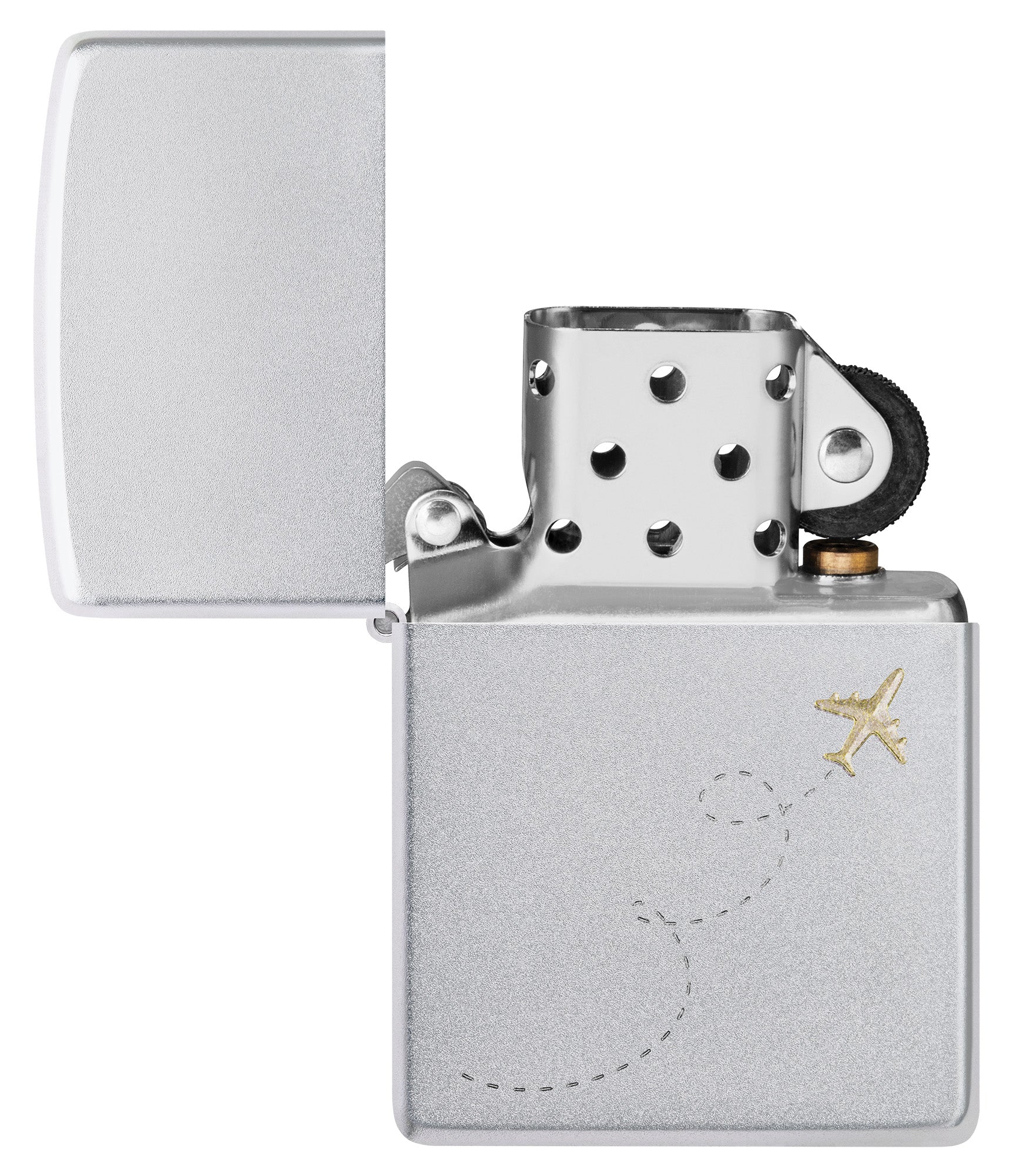 Wherever your travels take you, make sure this classic Satin Chrome lighter comes along. The minimalist Auto Two-Tone design depicts an airplane and its flight path in contrasting brass and chrome tones.