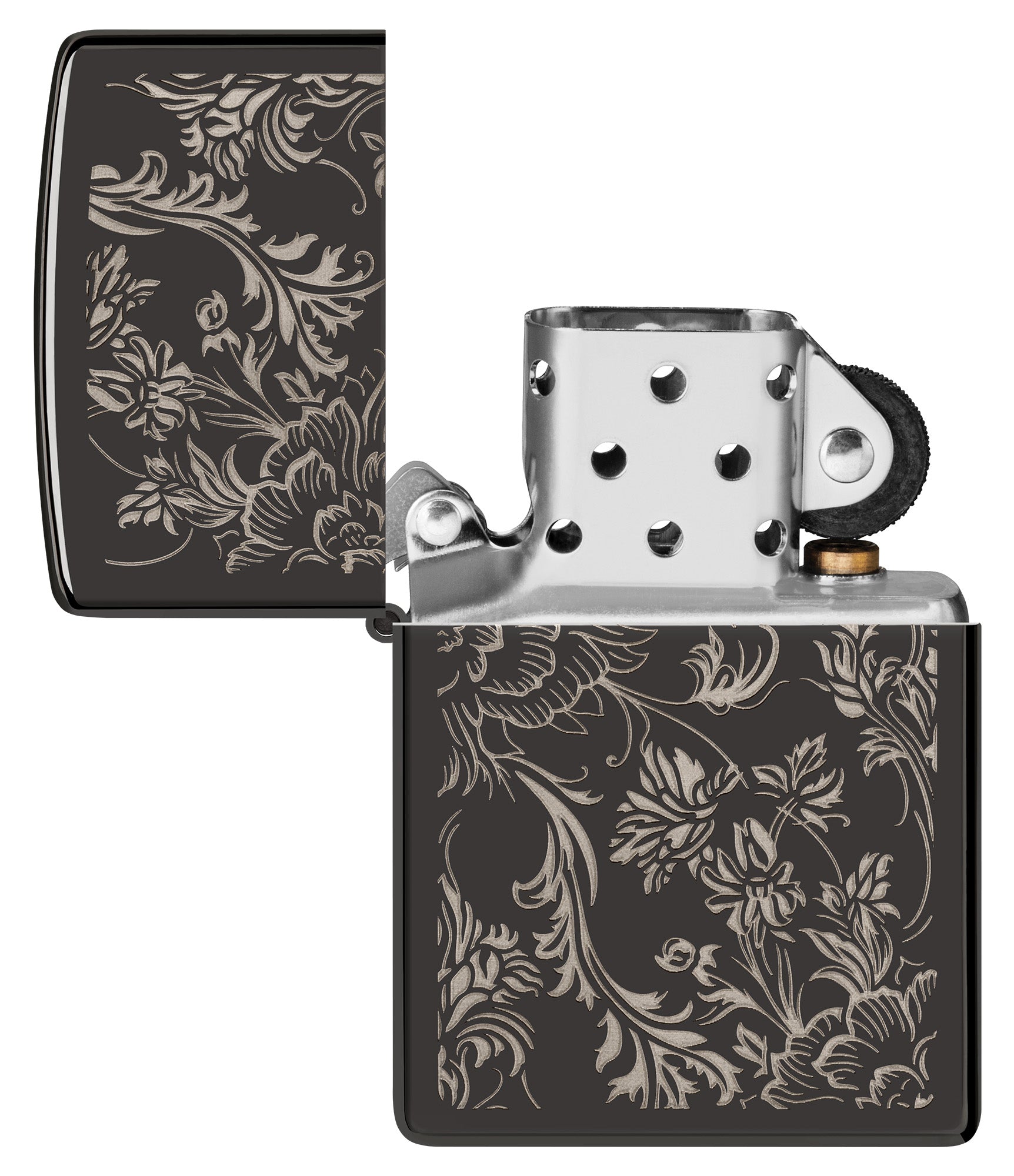 Add a timeless flourish to your collection with this classic High Polish Black lighter. Elegant florals swirl across the surface of the piece in an intricate Laser Engrave design.