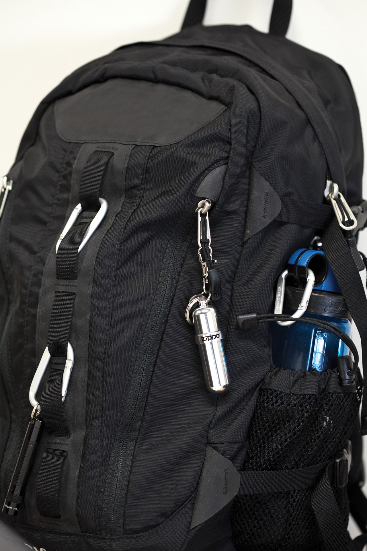 Take along an extra refill of Zippo premium lighter fluid. Reusable personal-sized aluminum canister holds enough fuel to fill one Zippo windproof lighter or a 6 hour fill on a Hand Warmer. Includes swivel snap fastener, split ring for keys, disk to tighten and loosen flint screw, and rubber storage sleeve for an extra Zippo flint.