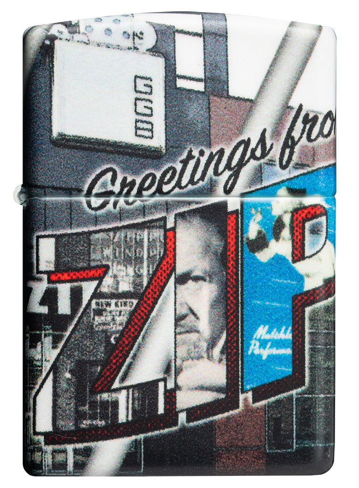 Greetings from Zippo- Home of the Zippo Windproof Lighter! In this 540 Colour design, Zippo artists take inspiration from iconic greeting postcards. "Greetings from Zippo" is wrapped around the windproof lighter, with Zippo's Bradford, PA headquarters in the background. Displayed within each letter is an iconic reference to the Zippo brand. Can you name them all? Comes packaged in a gift box. For optimal performance fill with Zippo lighter fuel.