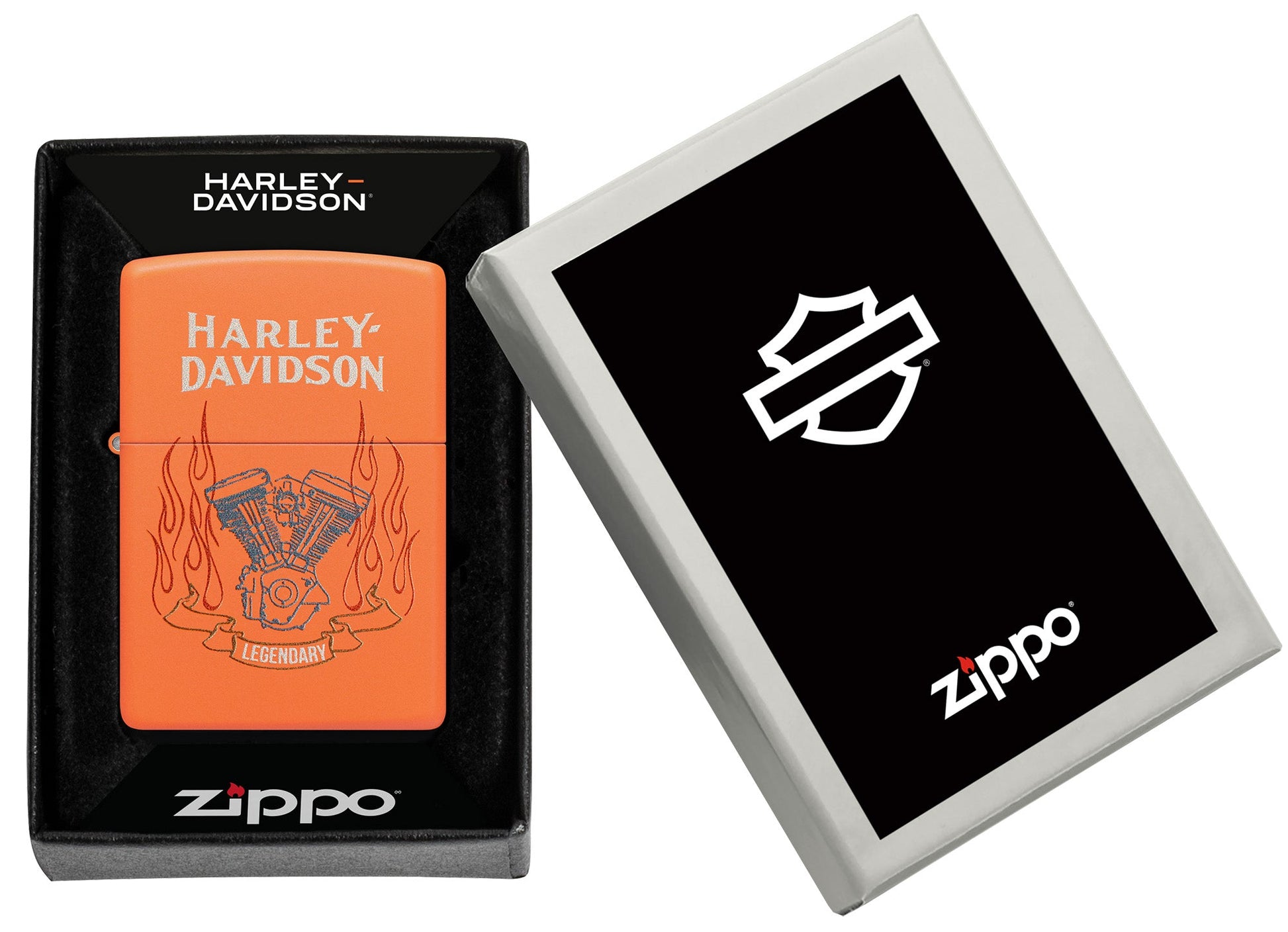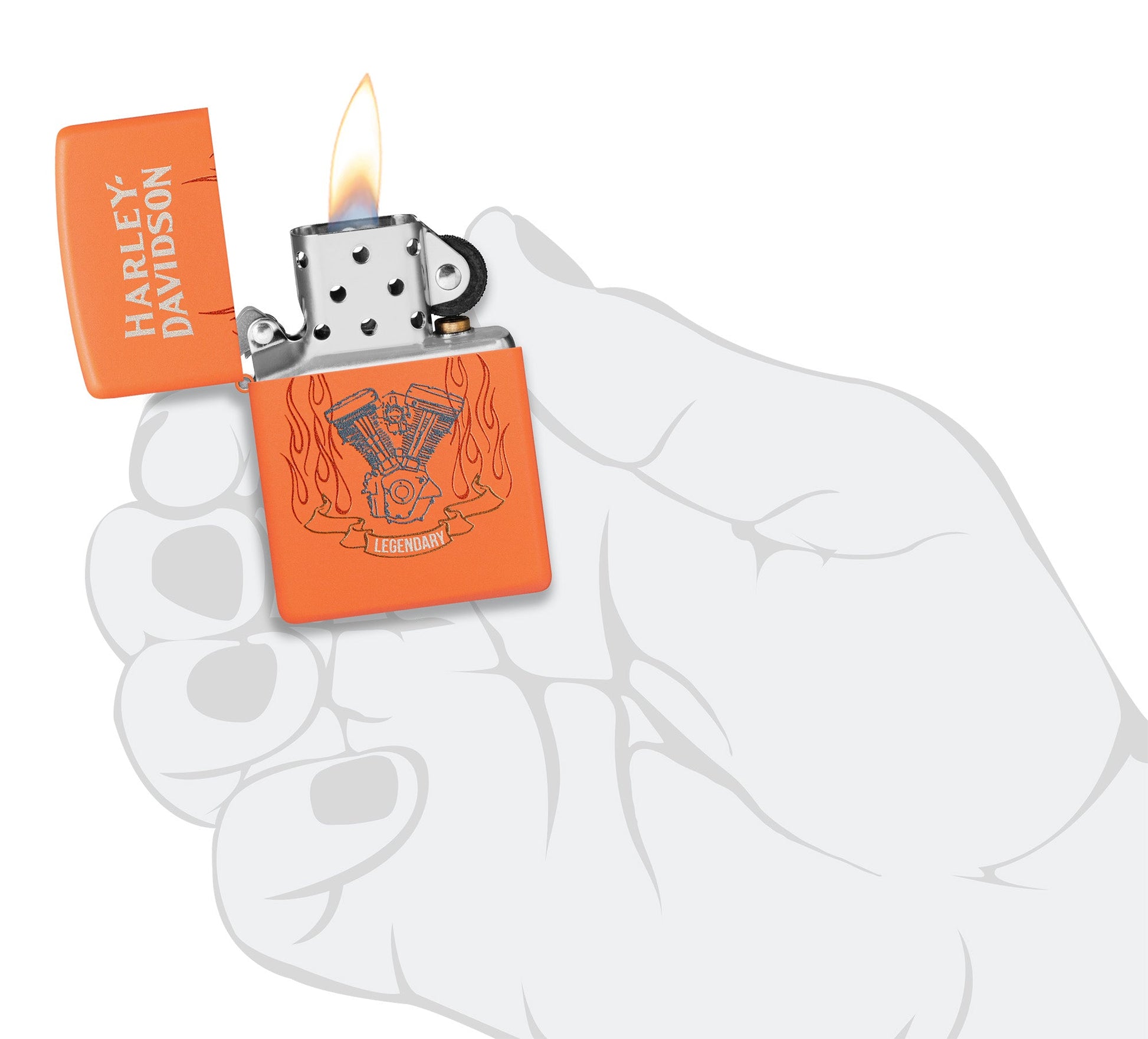 Surrounded by flickering flames and a banner inscribed with, "Legendary," an iconic Harley-Davidson® engine is pictured on this classic Orange Matte lighter beneath the Harley-Davidson wordmark in a thrilling Color Image design.