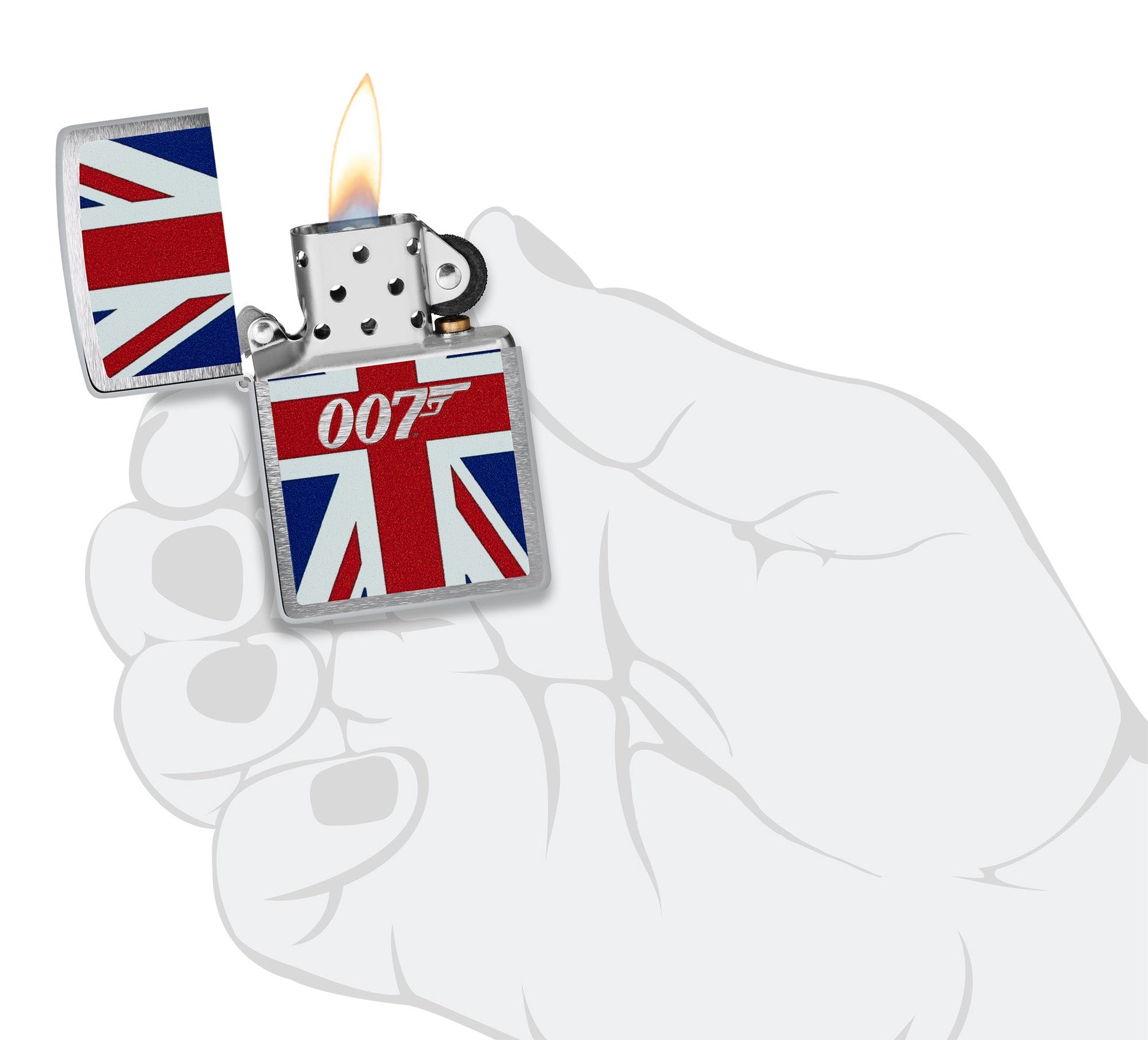 The iconic 007™ logo commands the surface of this classic Brushed Chrome lighter over a Color Image design of the Union Jack flag. The logo is revealed using the lighter's finish beneath the design for added depth.