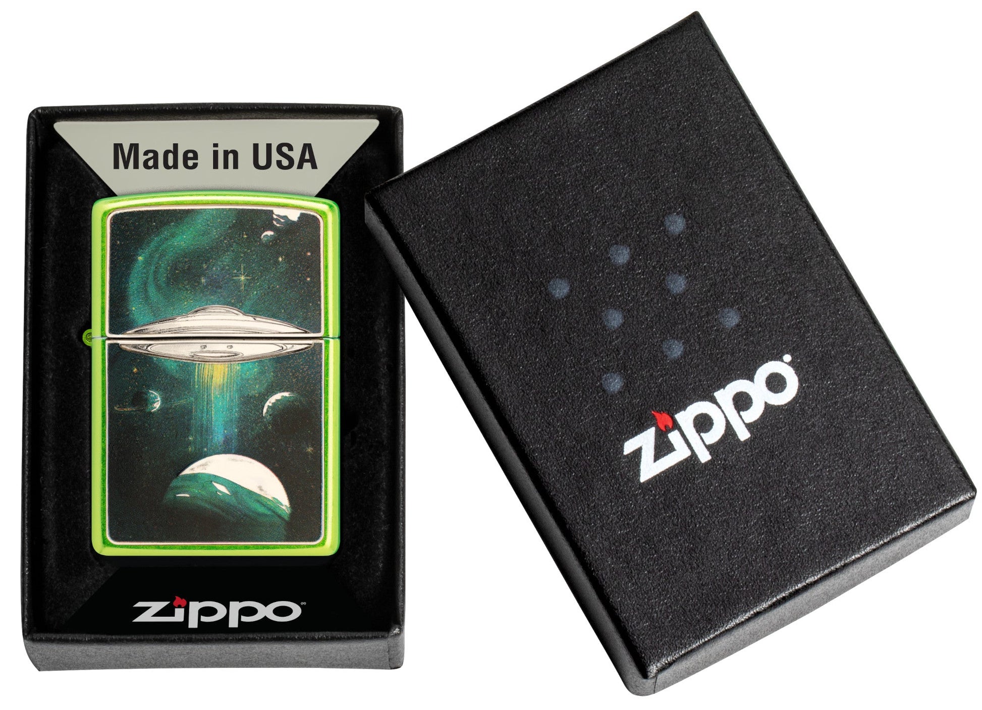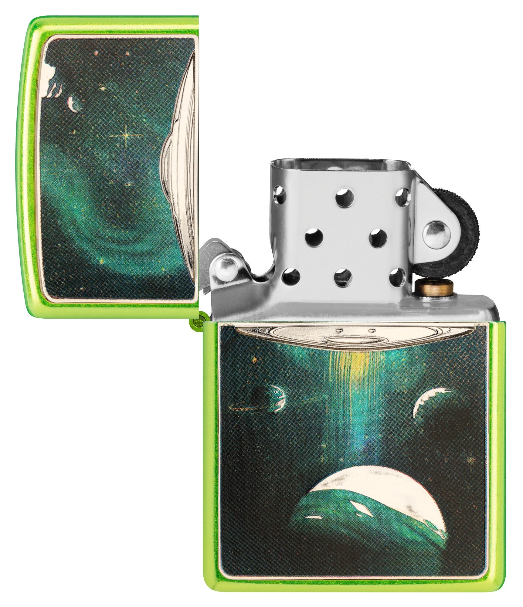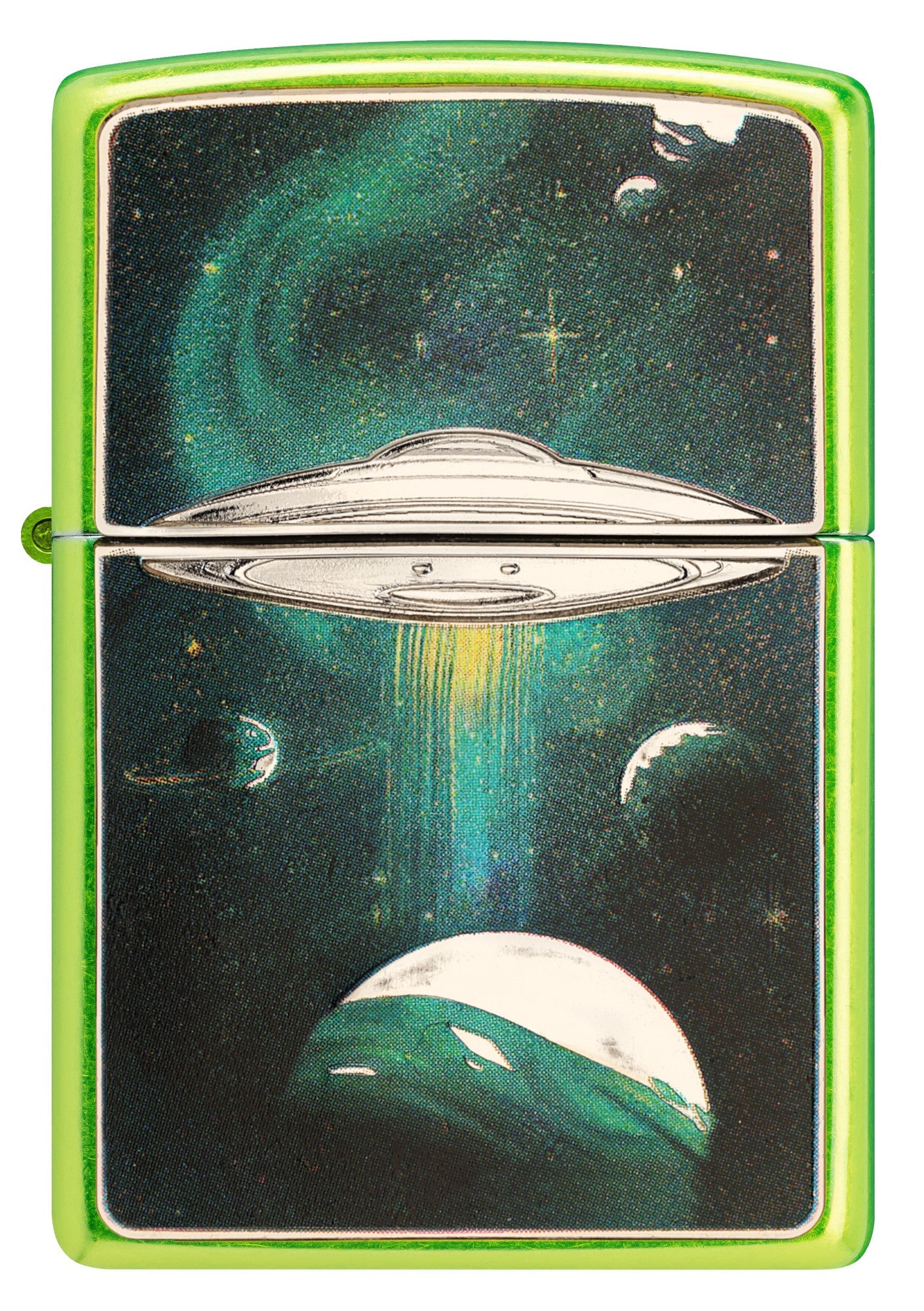 This classic Lurid lighter is the perfect backdrop for a vibrant metallic emblem that depicts an alien spacecraft casting a beam of light onto an unsuspecting planet.