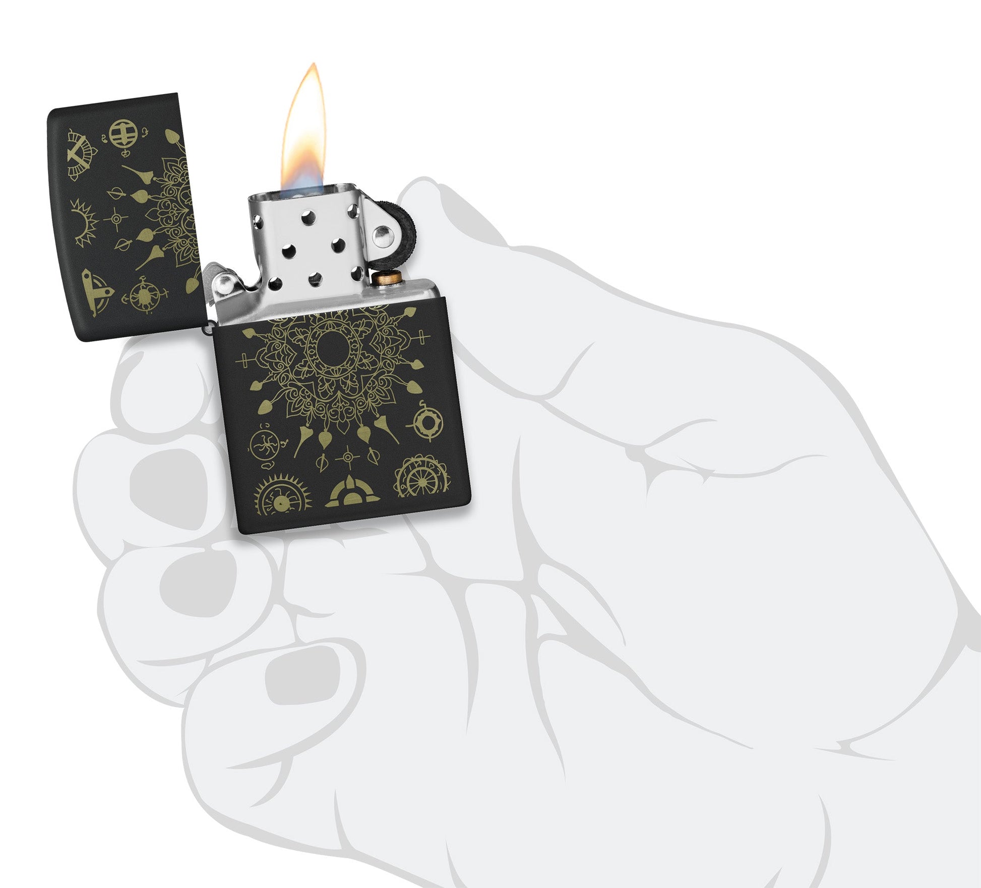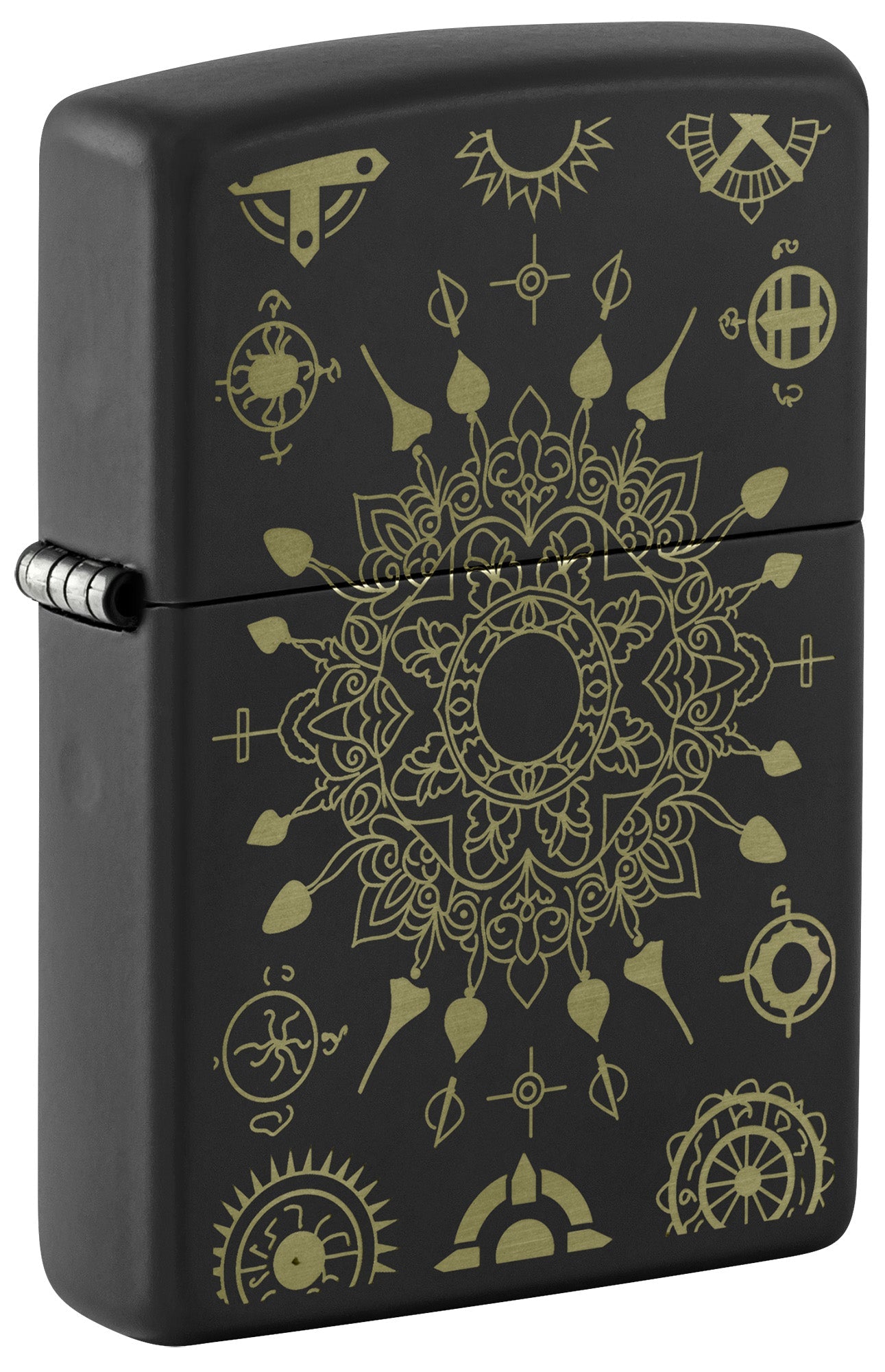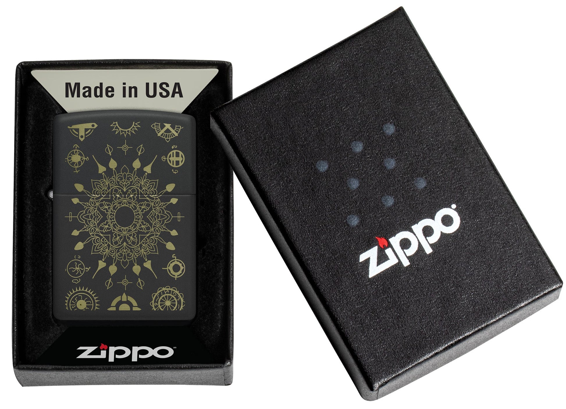 Add some calm and tranquility to your collection with this classic Black Matte lighter. A mesmerizing mandala motif is intricately laser-engraved onto the surface to reveal rich brass tones beneath the lighter's finish.