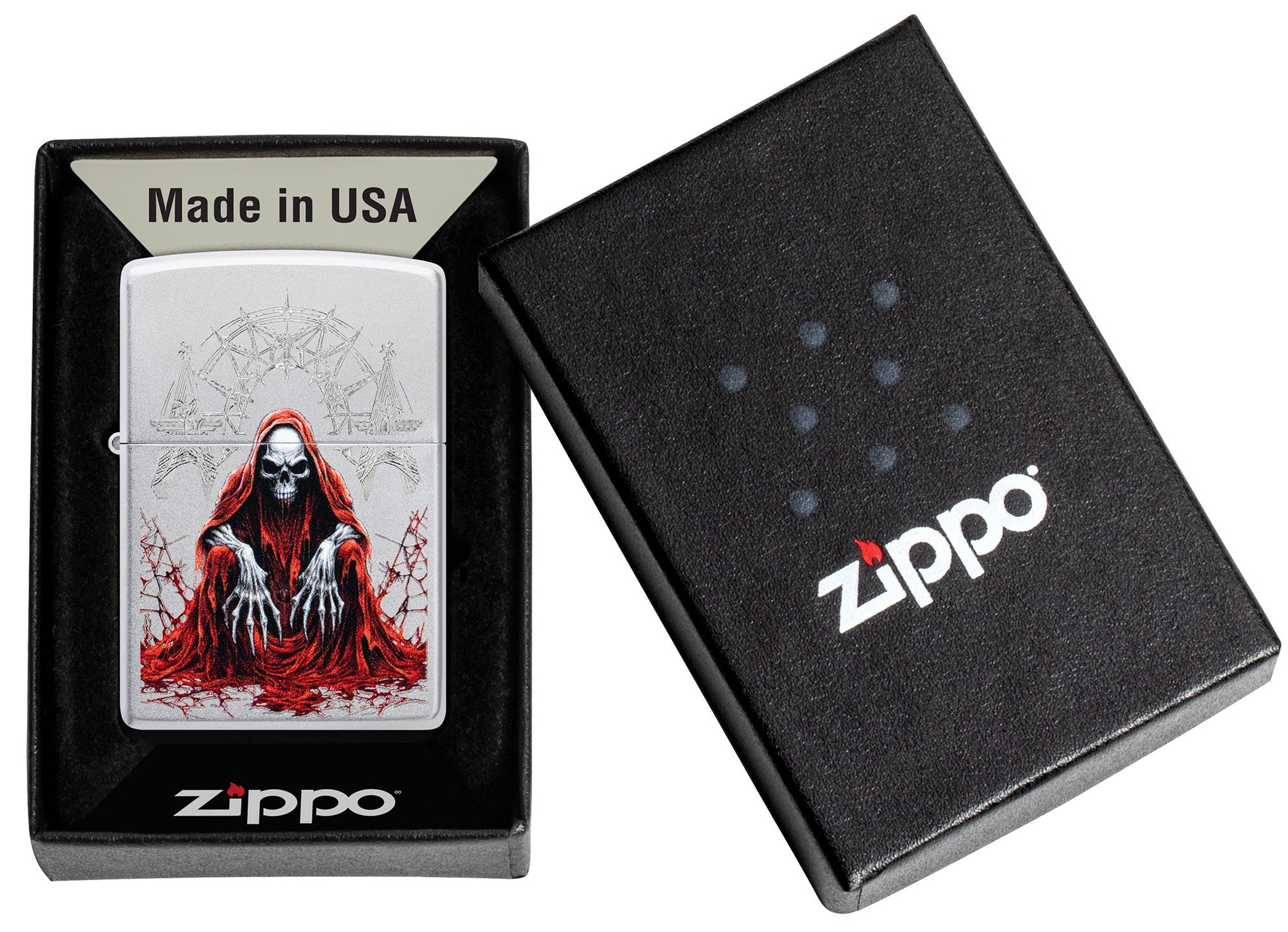 Cloaked in a blood-red robe, a frightful grim reaper lurcher toward the foreground of this classic Satin Chrome lighter in a chilling Color Image design. A gothic-style arch, etched with our Auto Engrave texture, adds depth and texture to the lighter's surface.