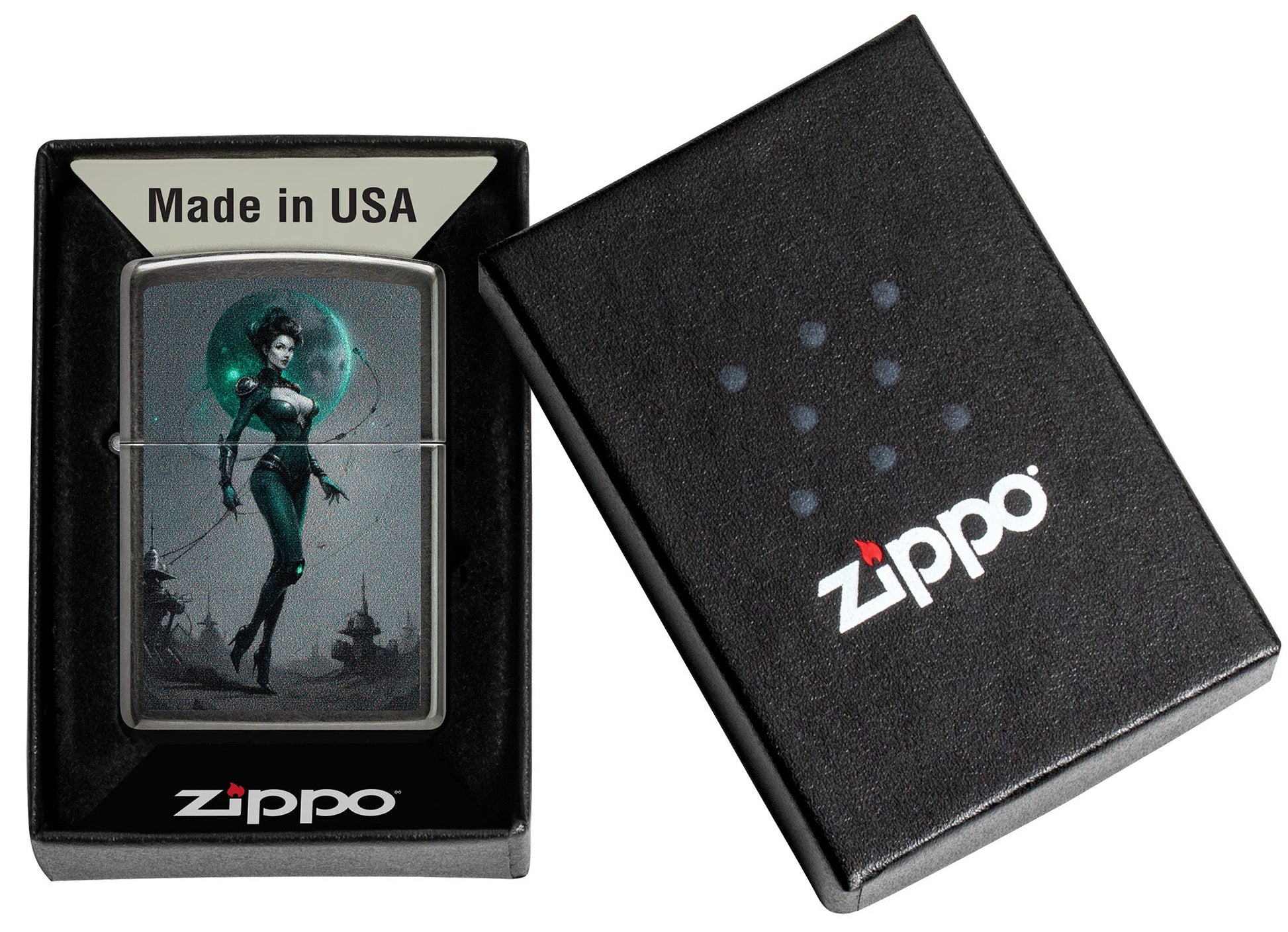 A futuristic pinup model poses on the surface of this classic Grey lighter in a sci-fi inspired Color Image design.