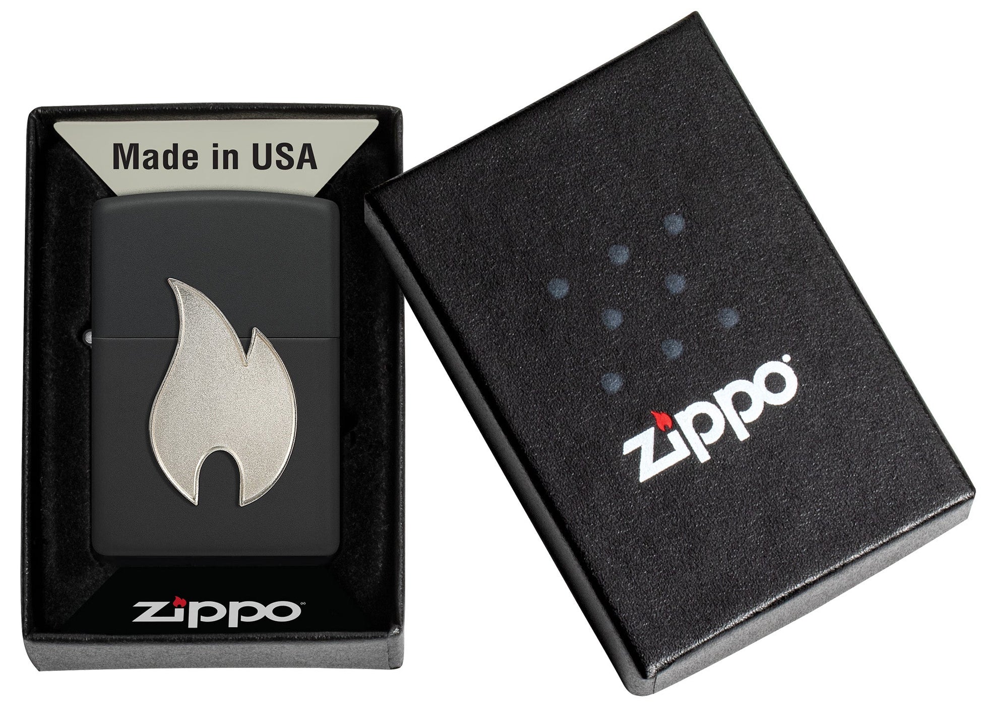 This classic Black Matte lighter features the Zippo flame icon on a bright silver metallic emblem, which stays in place when the lighter is opened.