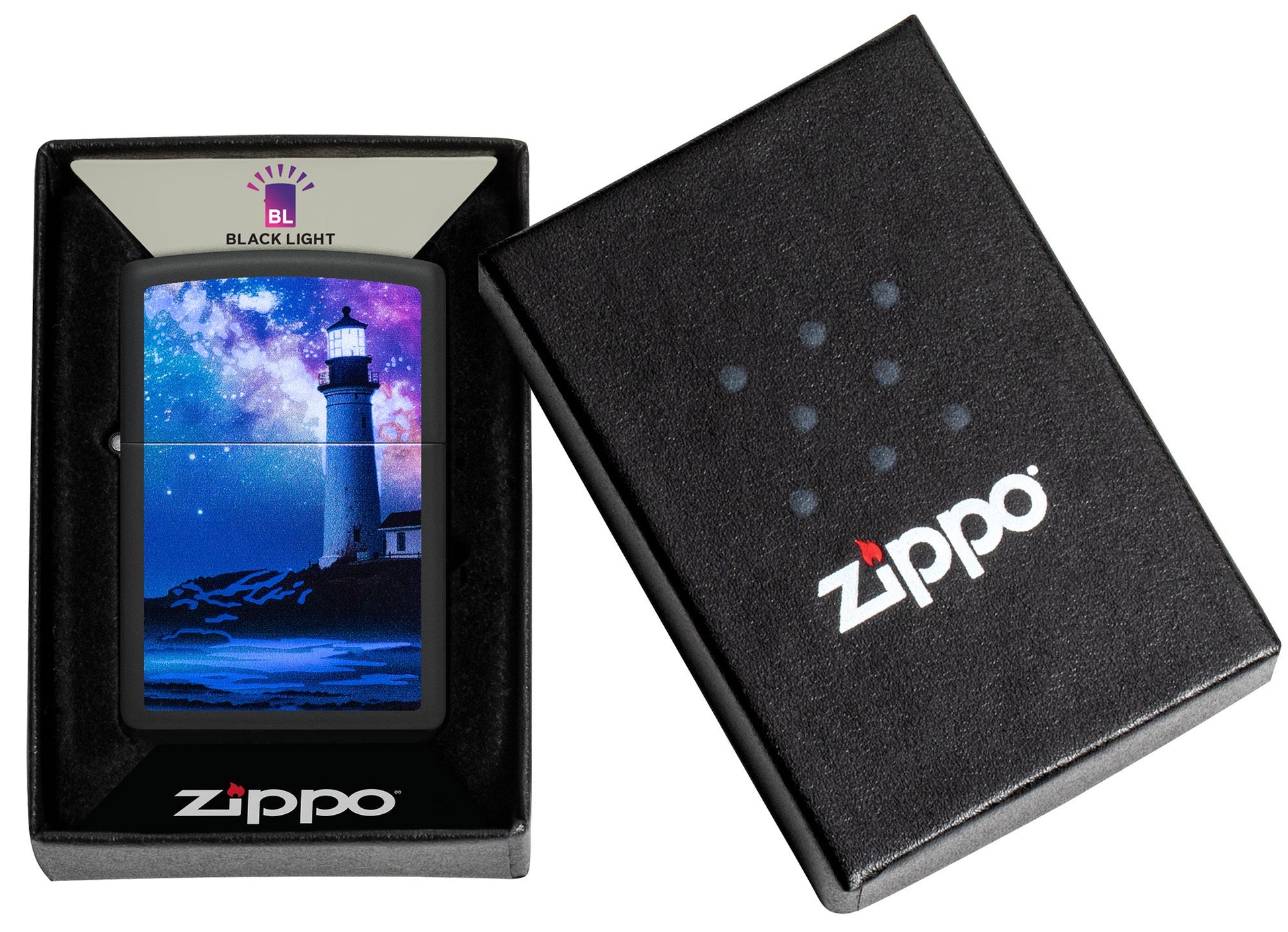 Backed by a brilliant starry sky, a lone lighthouse stands as a bright beacon on the surface of this classic Black Matte lighter in a serene Color Image design, which illuminates under ultraviolet light thanks to our specialty Black Light process.