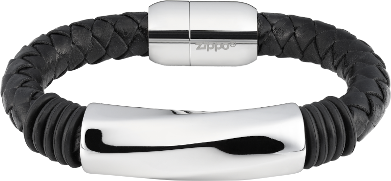 Real leather bracelet consisting of one individual thin leather plaited strap, decorated by a stainless steel case. The flat clasp of the bracelet has an integrated magnet with each end simply pushing together to secure on your wrist. The inside of the clasp is decorated with the original Zippo logo with the outside featuring the Zippo flame.