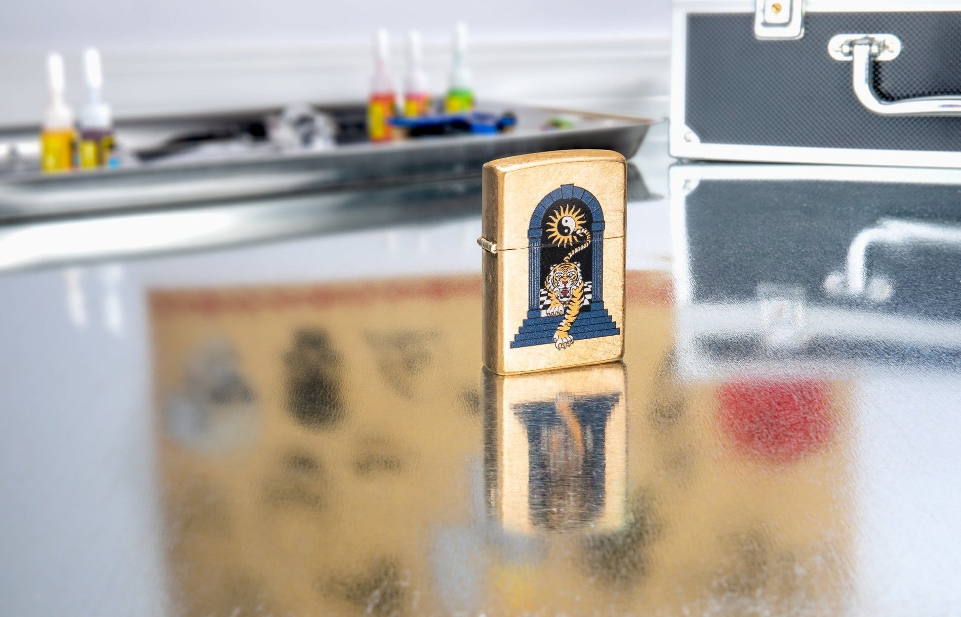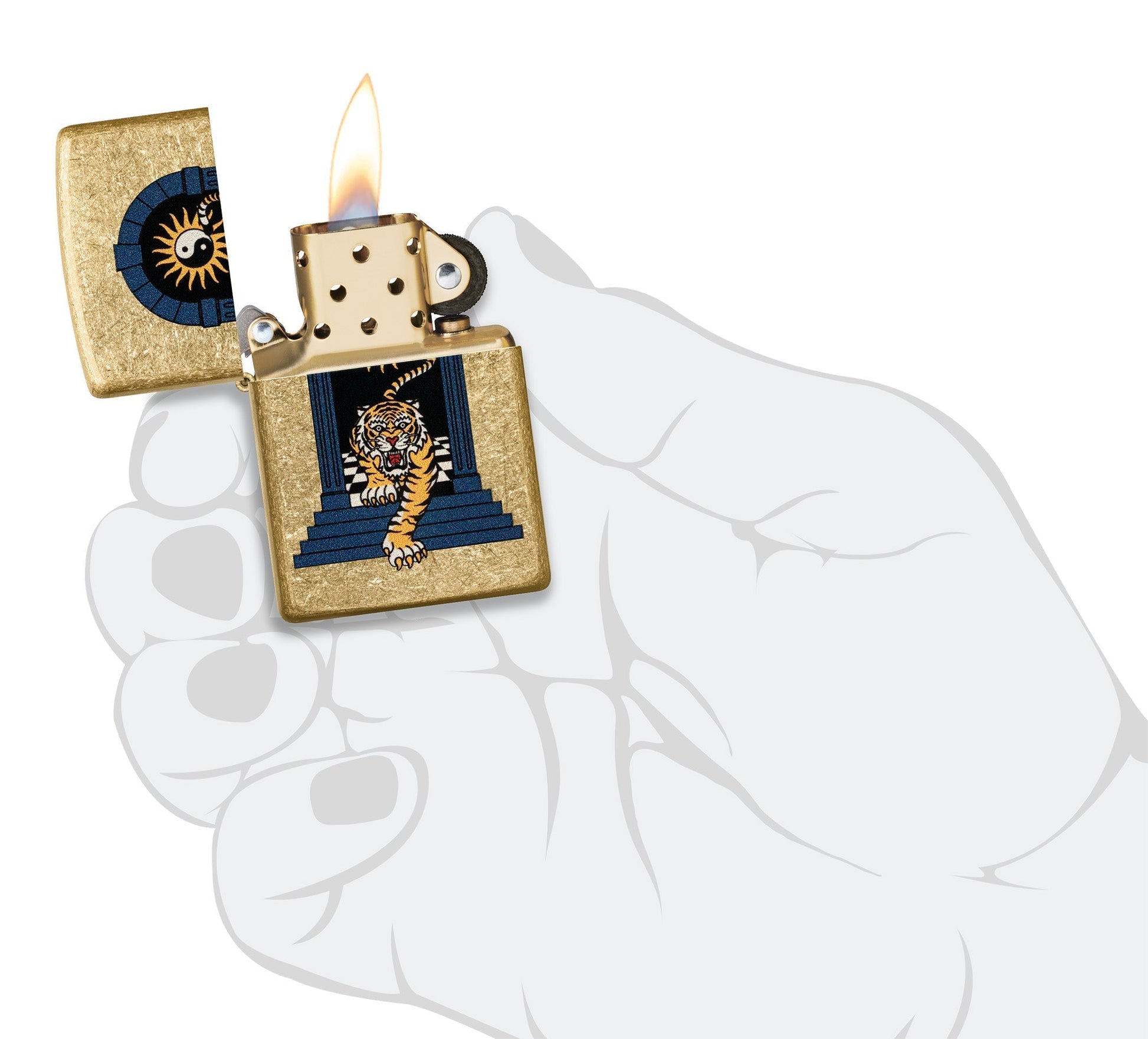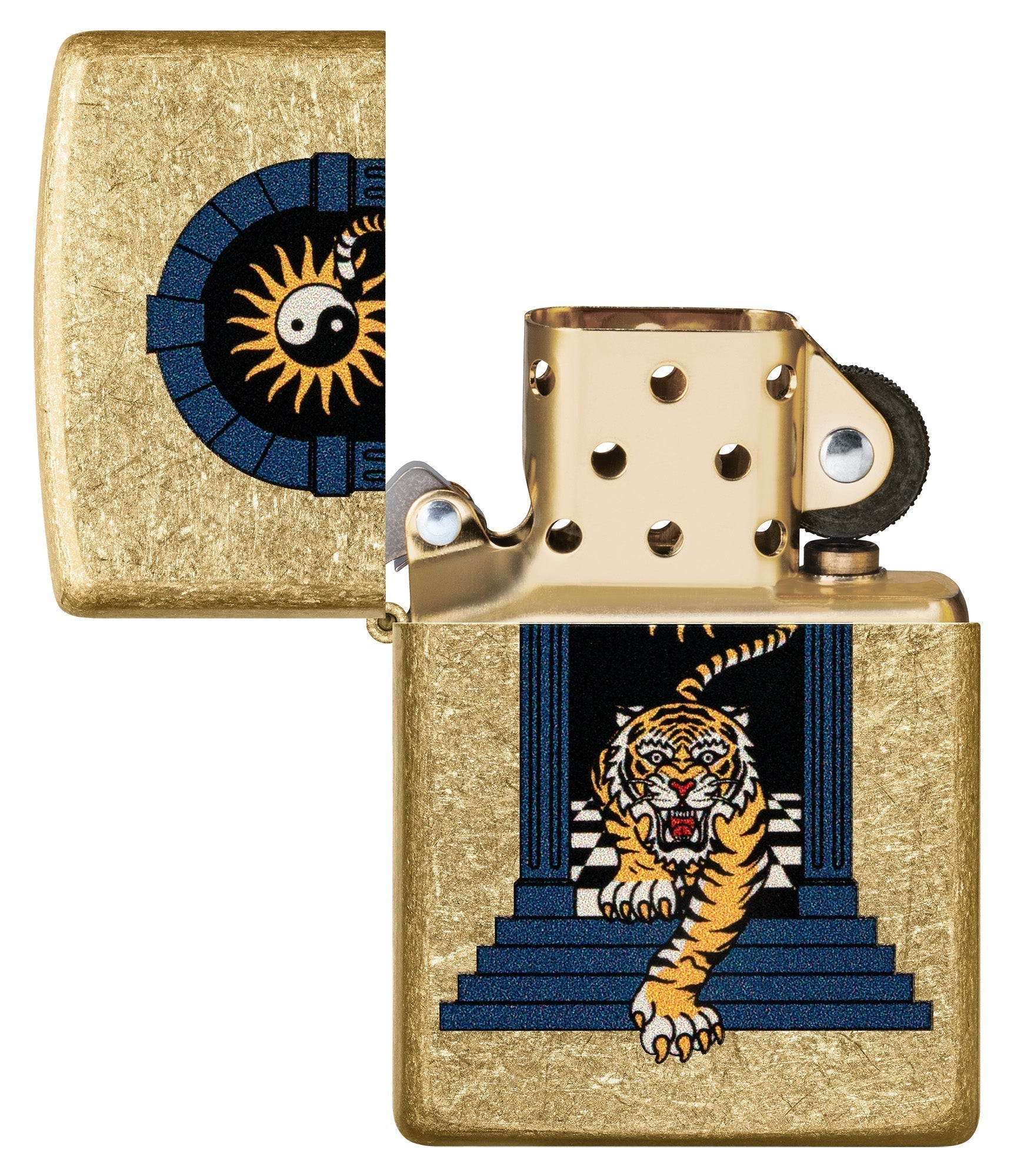 The tumbled brass surface gives the lighter a rustic yet stylish look. The colourful motif of the tiger striding through the gate symbolizes strength, courage and freedom. The yin & yang symbol in the background refers to harmony and the balance between opposites.
