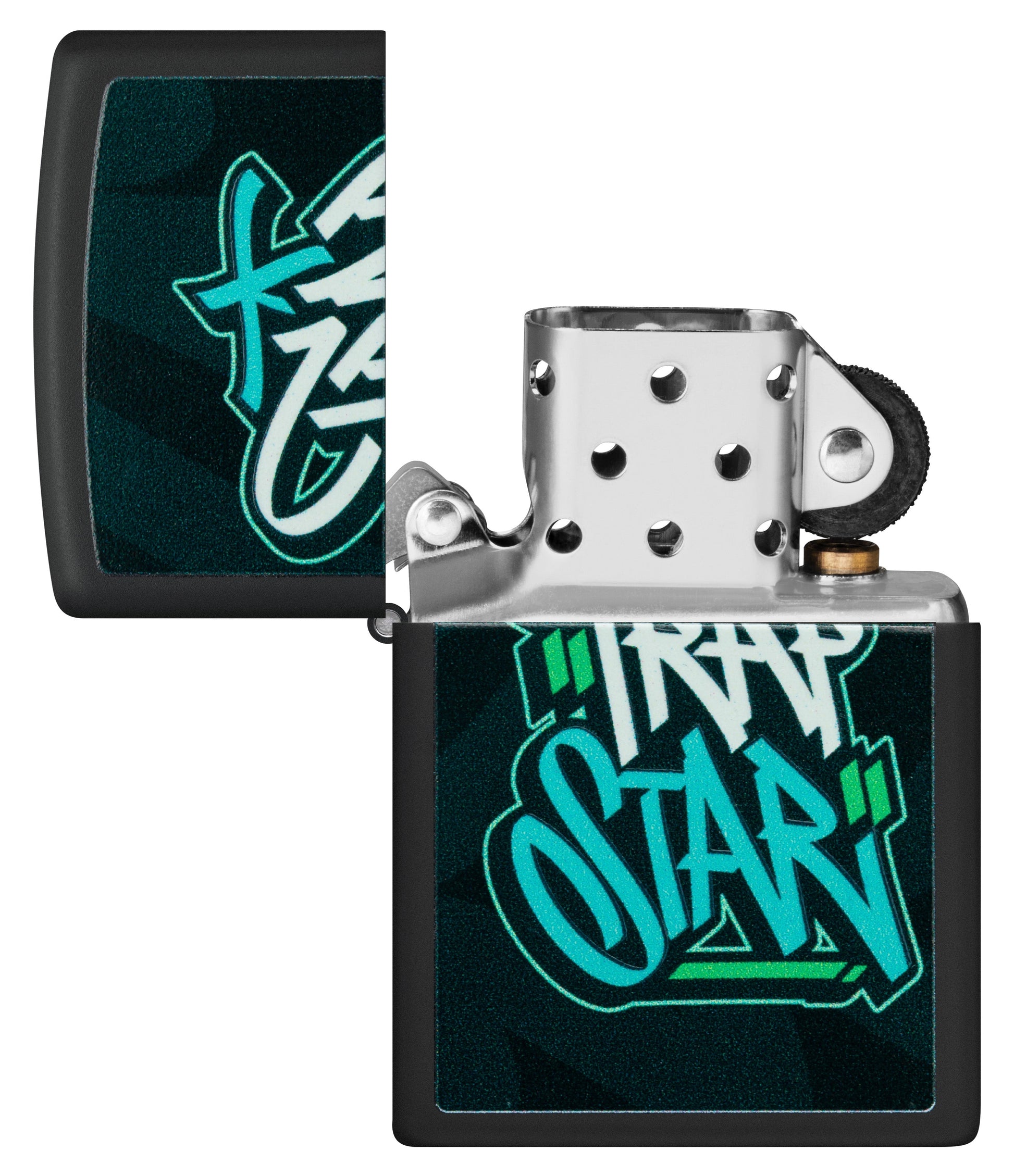 The Trap Star design is an impressive lighter that embodies the style and energy of the trap music scene. With its striking black matte finish and exciting graffiti motif with the words "Trap Star", it is guaranteed to stand out.