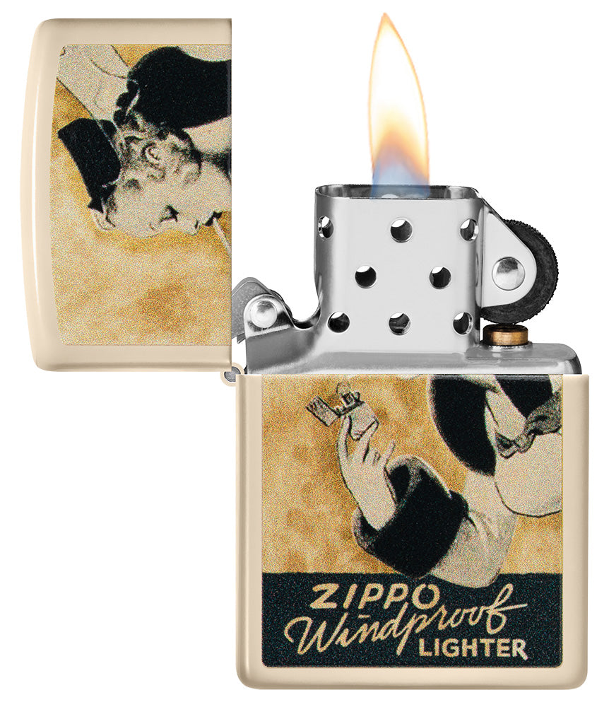 Following Zippo's first national advertising campaign, this Color Image motif features Windy in a vintage look. The glamorous "fan test" advertising model, in a style that fits perfectly with a Flat Sand lighter.