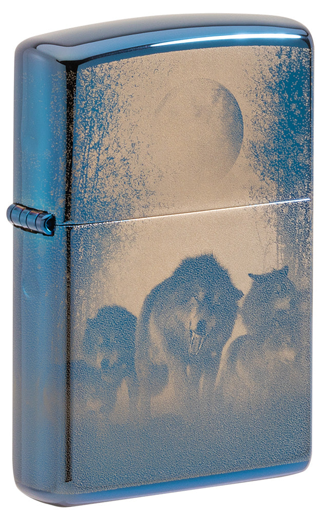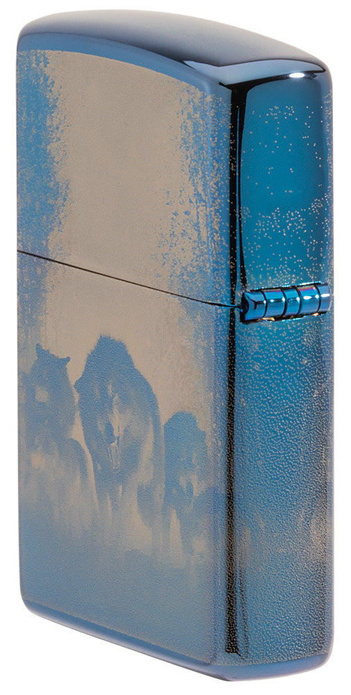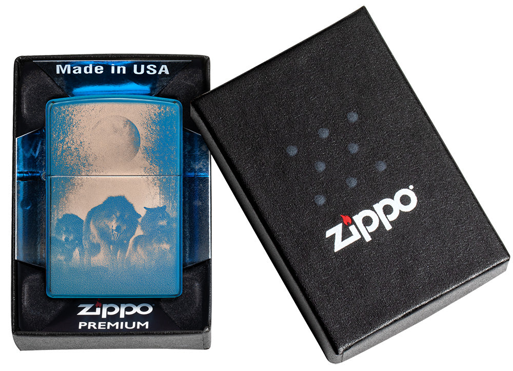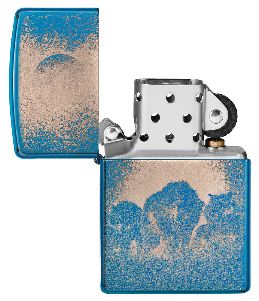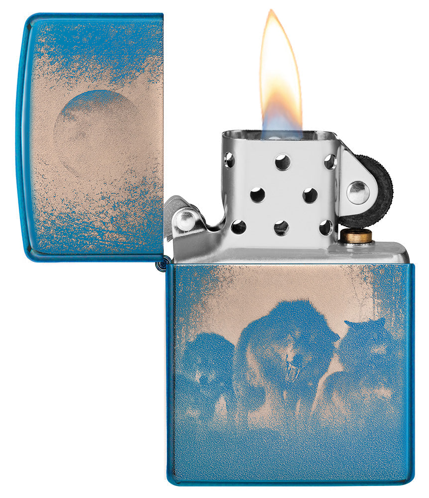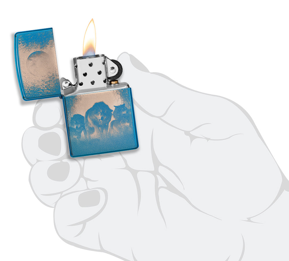 The highly polished blue surface gives the lighter a sophisticated and appealing look. The detailed photo of the wolf pack and the full moon creates a captivating atmosphere and captures the wild beauty of nature.