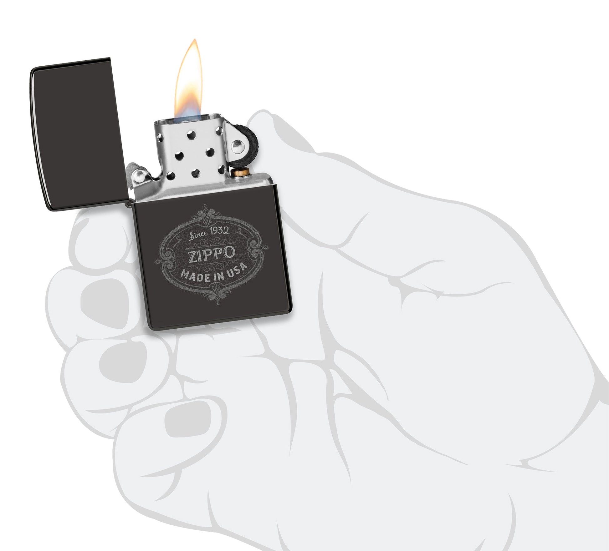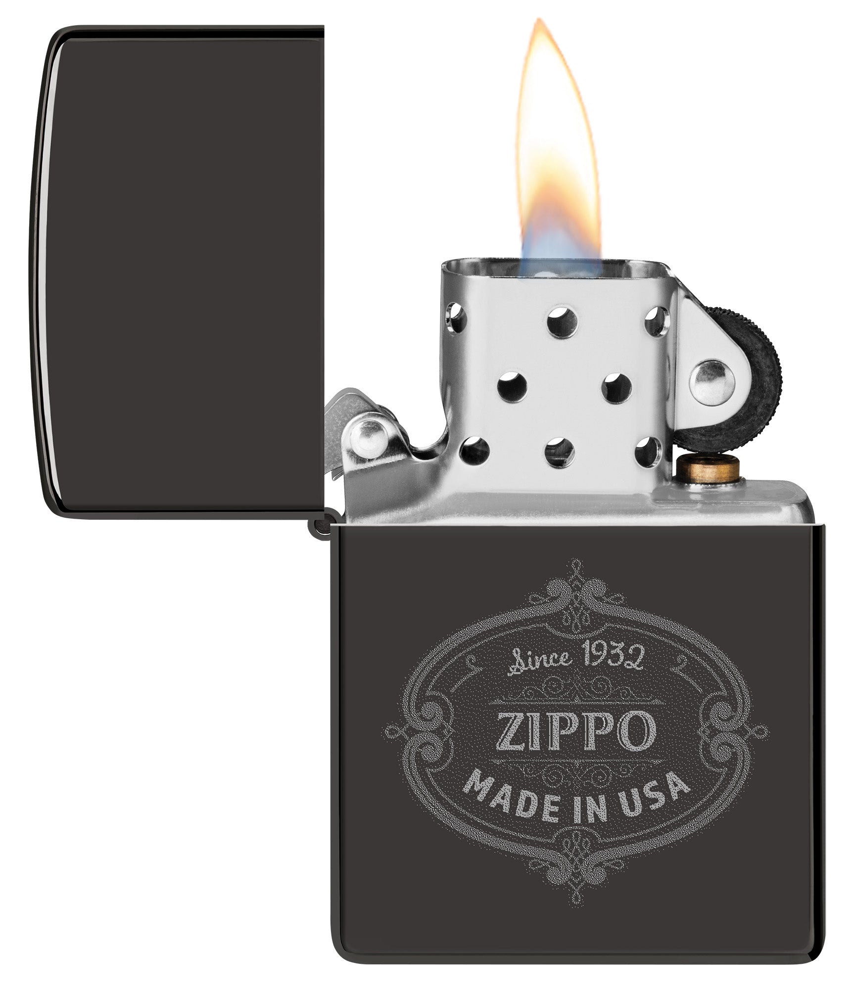 This classic High Polish Black lighter features the Zippo wordmark and founding year along with the inscription, "Made in USA," in an elegant Photo Image design.